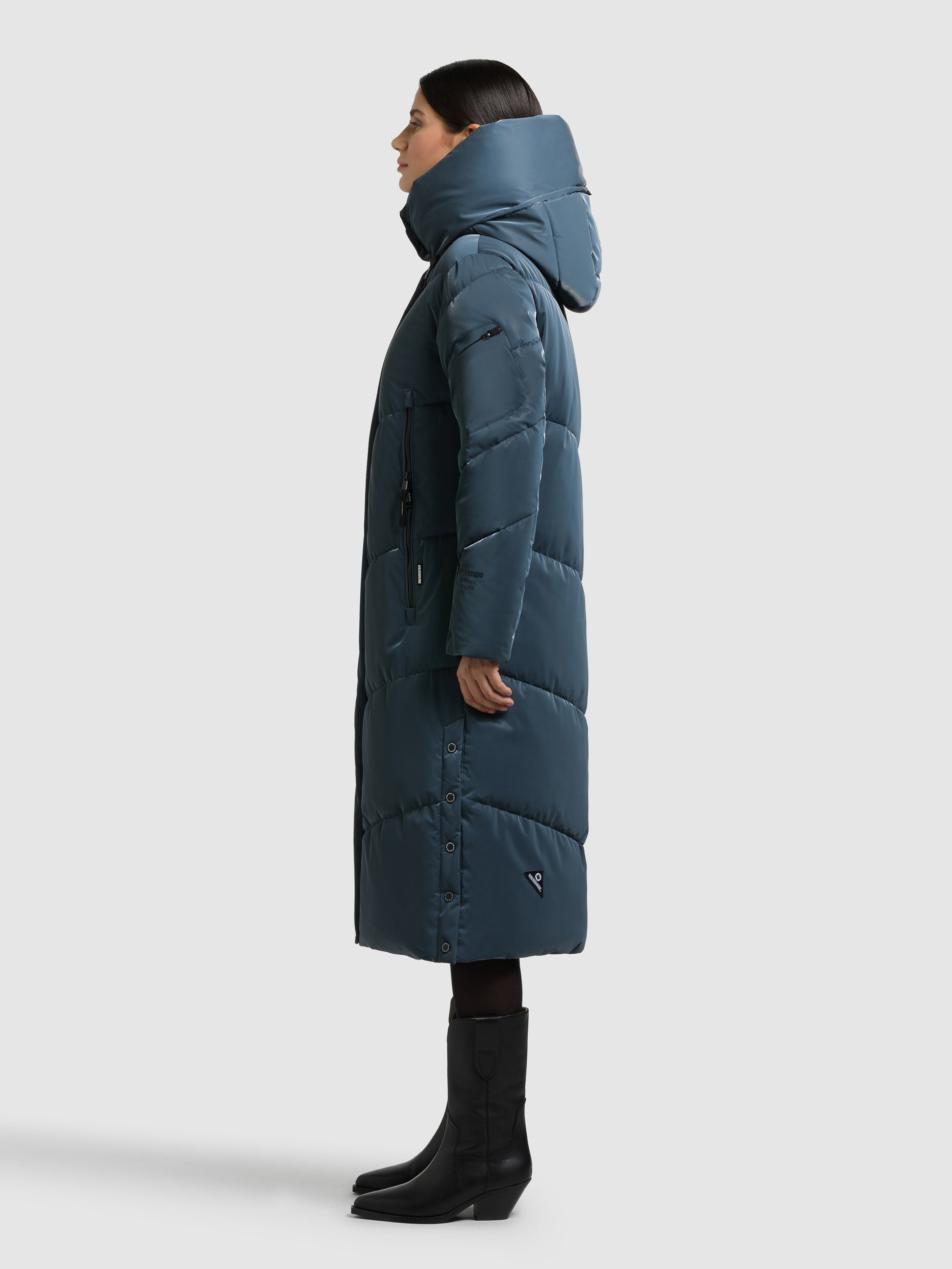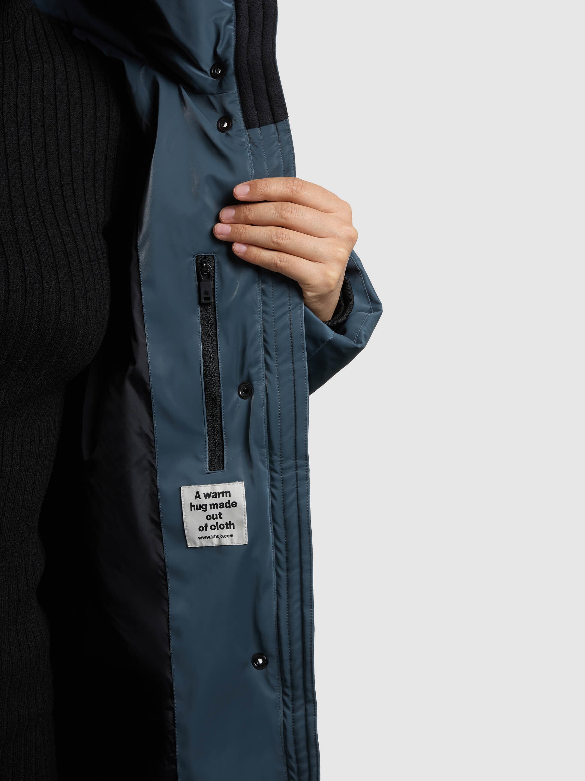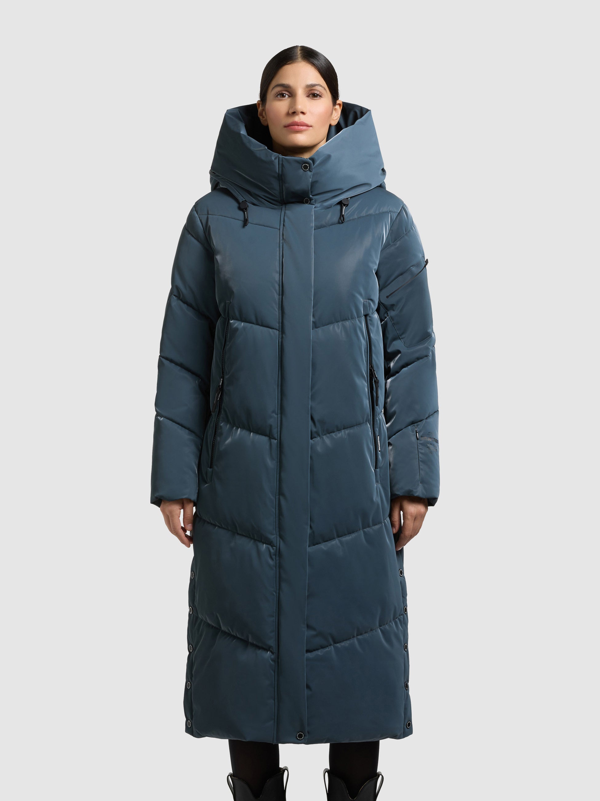 LIKE A WARM HUG: Das Motto vom khujo Mantel PULSET SHINY. Dank einer verstellbaren, hoch schließenden Kapuze, elastischen Bündchen am Ärmelfutter und Seitenschlitzen am Saum, bietet der seidig glänzende Steppmantel zuverlässigen Schutz vor kaltem Winterwetter. Der Zwei-Wege-Reißverschlus mit Kinnschutz, die Windschutzblende mit Druckknöpfen und große, mit Fleece gefütterte Reißverschlusstaschen bezeugen bei dem schimmernden Wintermantel mit softer Haptik einmal mehr die Leidenschaft für Details.