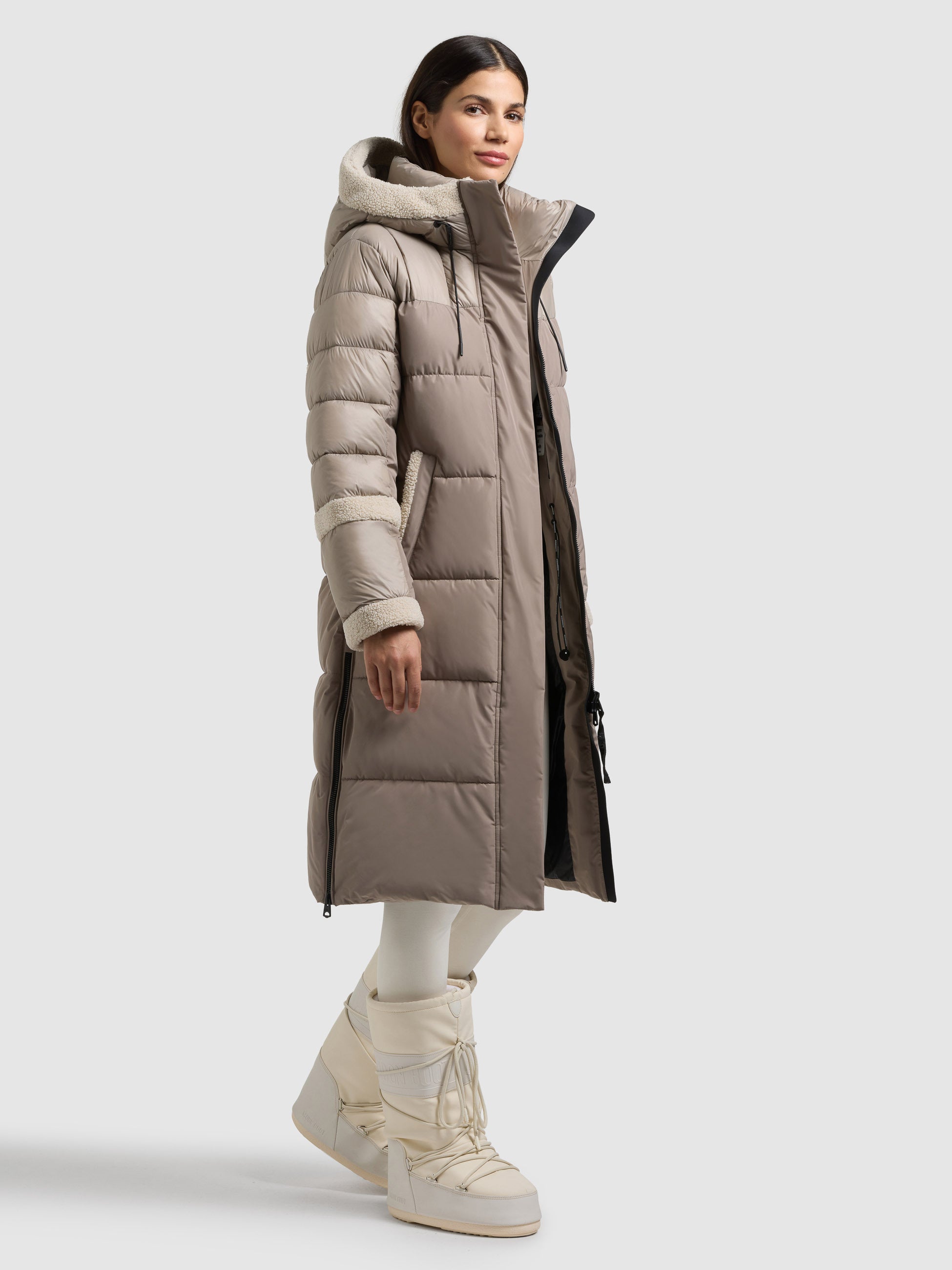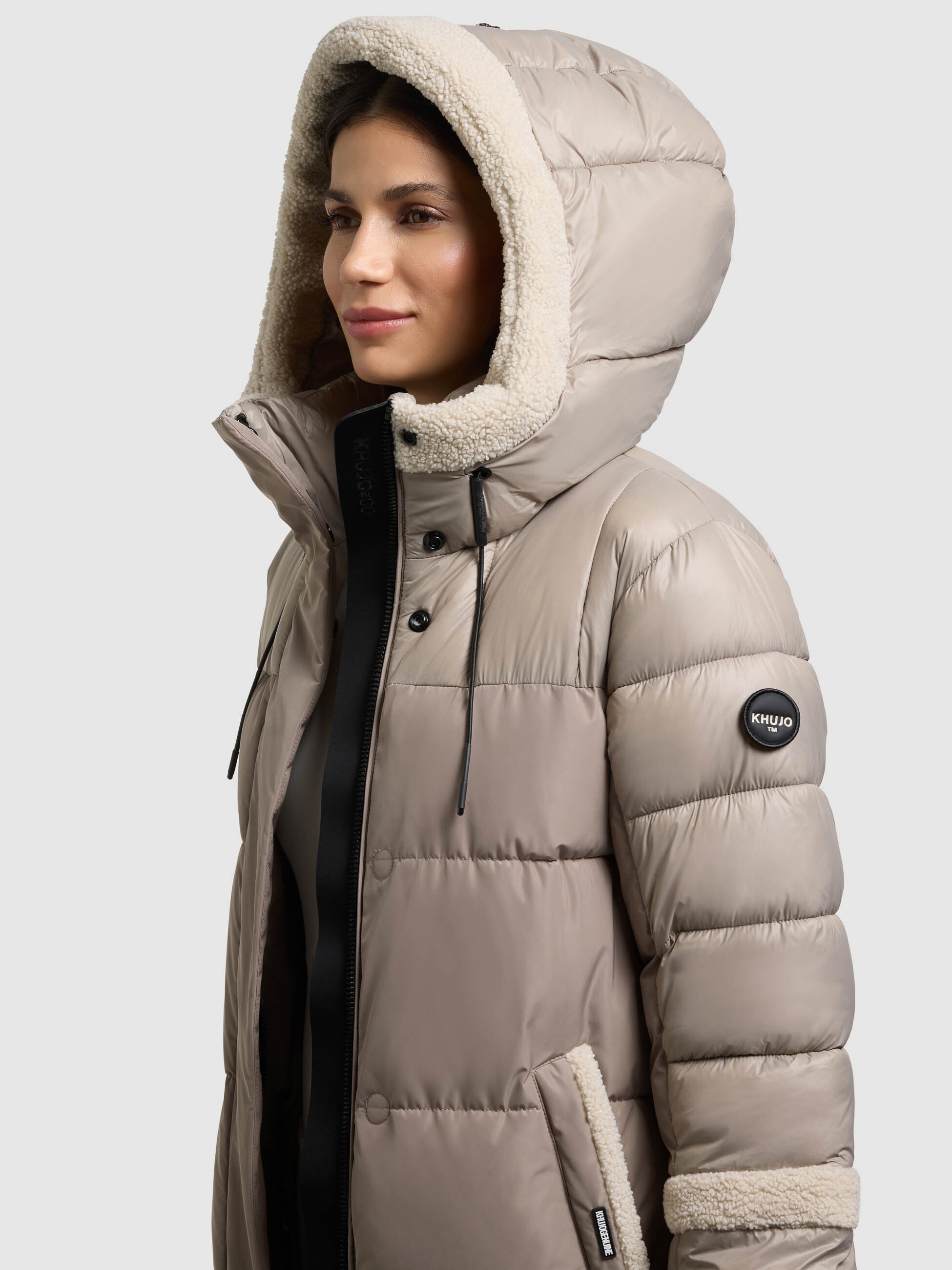 Mit dem khujo Mantel DESNA2 im Materialmix setzt du ein modisches Statement, das für echte Hingucker sorgt. Der Steppmantel mit Seitenschlitzen überzeugt dank weicher Teddyfleece-Besätze an der Kapuze, den Ärmeln und der Schulterpasse. Elastische Kordelzüge an der Kapuze und Taille sorgen für eine optimale Passform. Abnehmbare Rucksackträger, Fleece gefütterte Reißverschlusstaschen und ein Zwei-Wege-Reißverschluss mit Windschutzblende und Magnetverschluss runden das urbane Design gelungen ab.