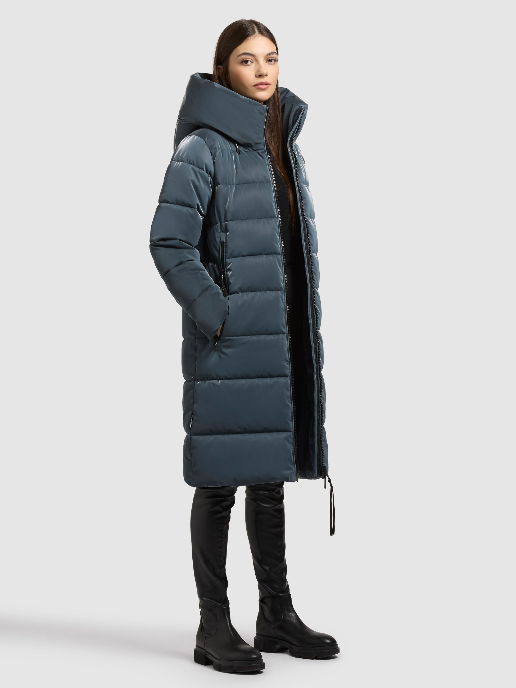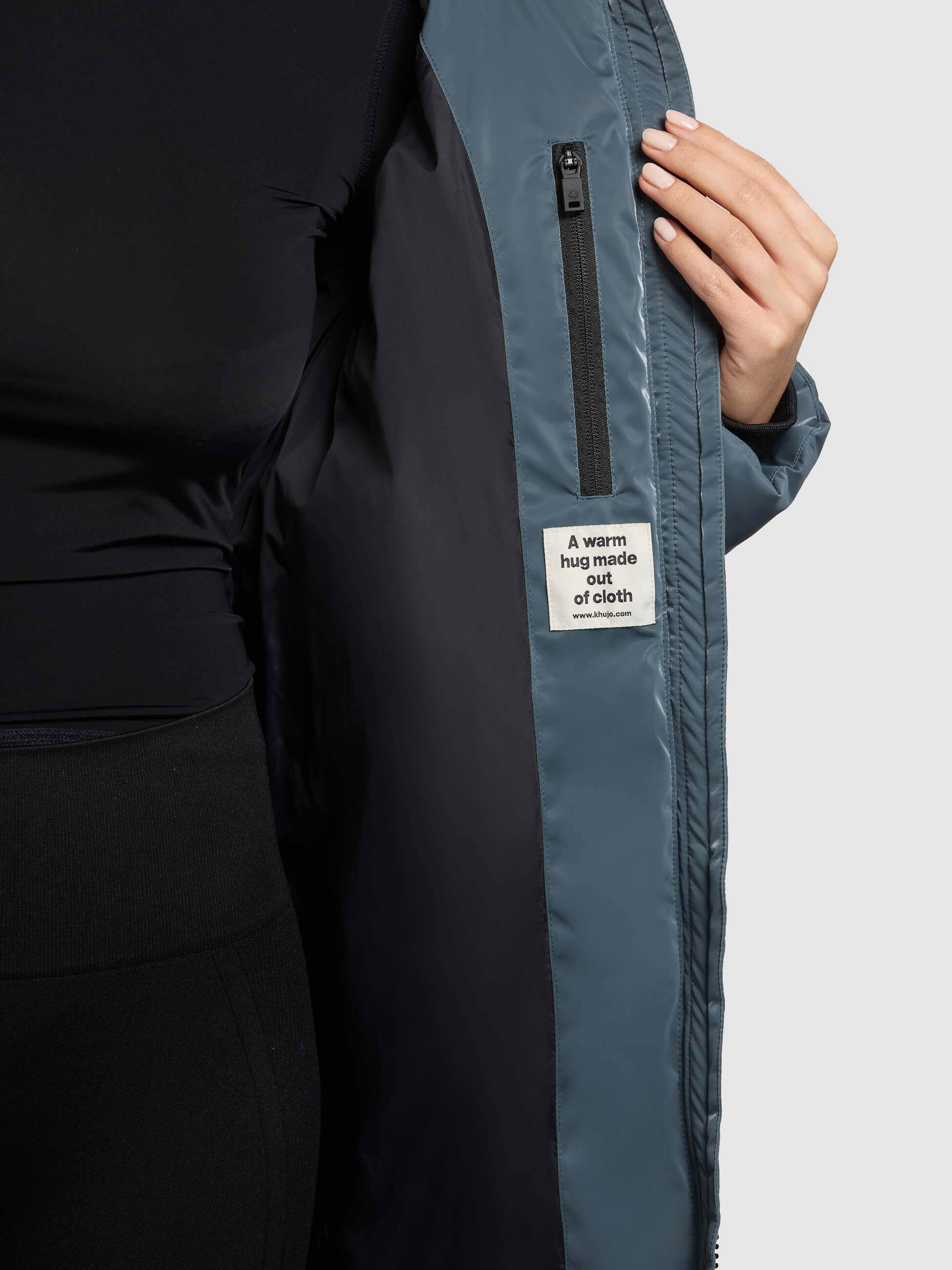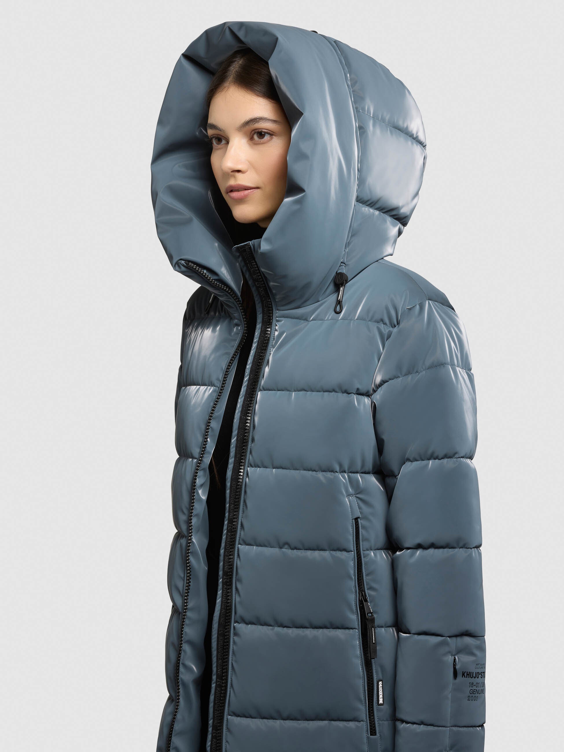 LIKE A WARM HUG: Das Motto vom khujo Mantel JILIAS6 SHINY. Dank einer verstellbaren, hoch schließenden Kapuze mit extrabreiter Krempe und elastischen Bündchen am Ärmelfutter bietet der seidig glänzende Steppmantel zuverlässigen Schutz vor kaltem Winterwetter. Der Zwei-Wege-Reißverschluss, eine verschließbare Innen- und Ärmeltasche sowie die großen, mit Fleece gefütterten Reißverschlusstaschen bezeugen bei dem schimmernden Wintermantel mit softer Haptik einmal mehr die Leidenschaft für Details.
