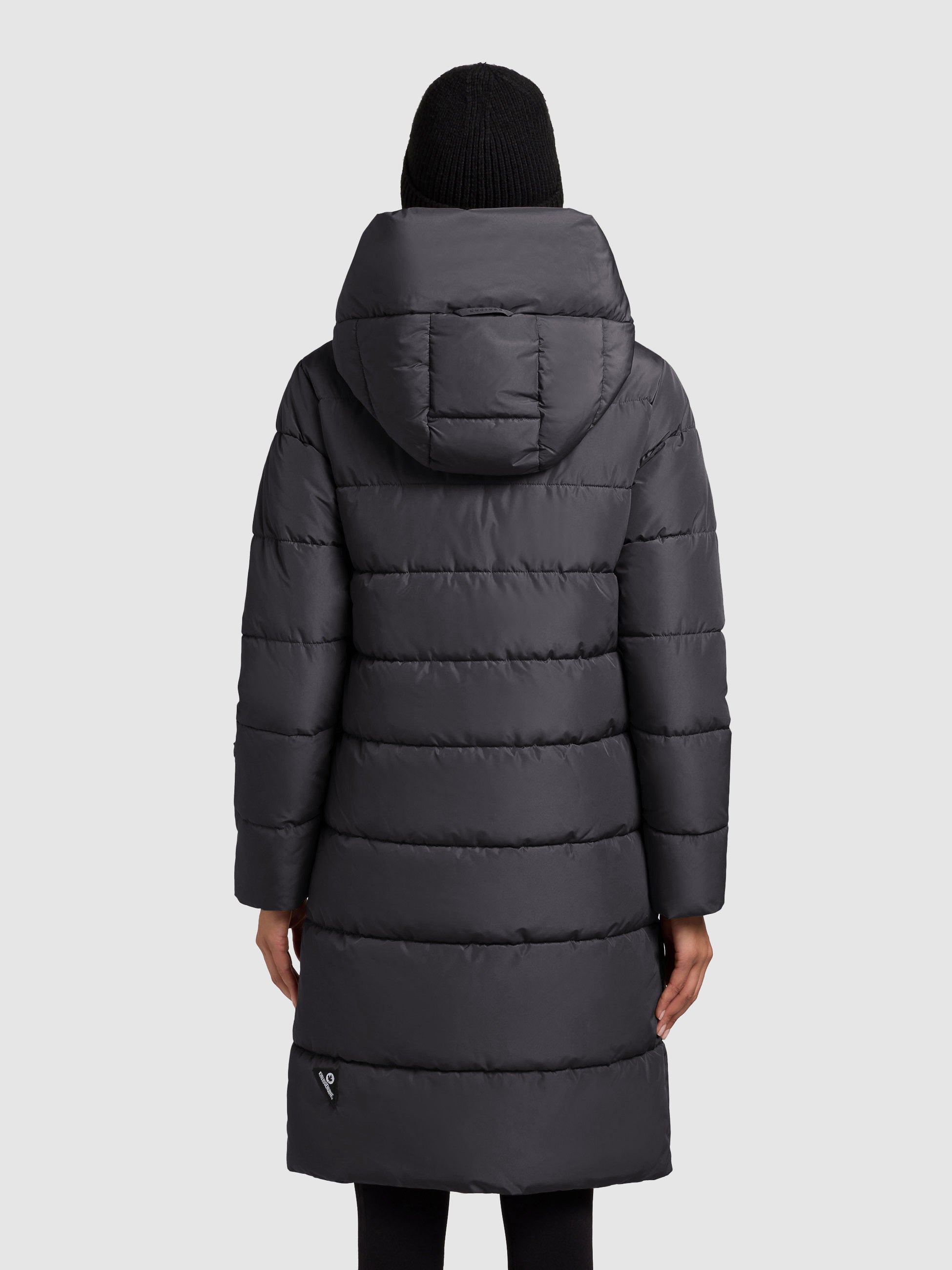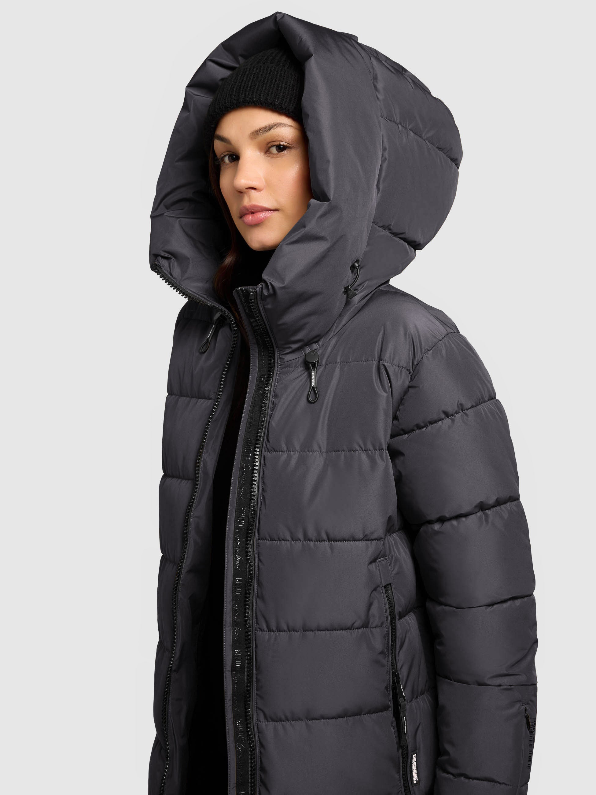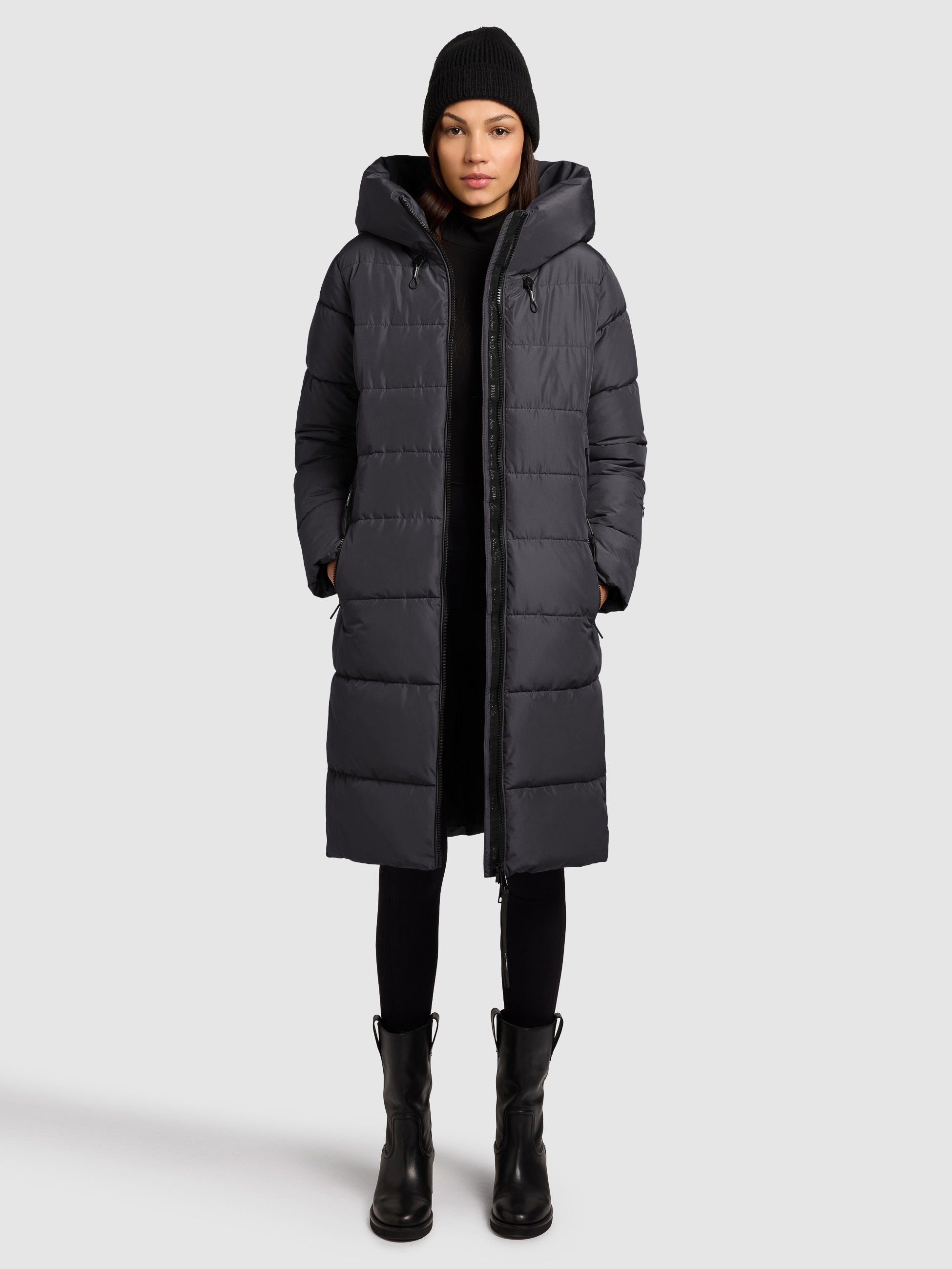 A high-closing hood with elastic drawstring, warm padding, elastic cuffs on the sleeve lining, and fleece-lined pockets provide protection during the khujo Coat JANGE is ready for cold winter weather. Thanks to the shortened two-way zipper, this knee-length quilted coat guarantees freedom of movement. Your belongings can also be stored in the side zip pockets, an inside pocket, or a water-repellent pocket on the sleeve of this winter jacket.