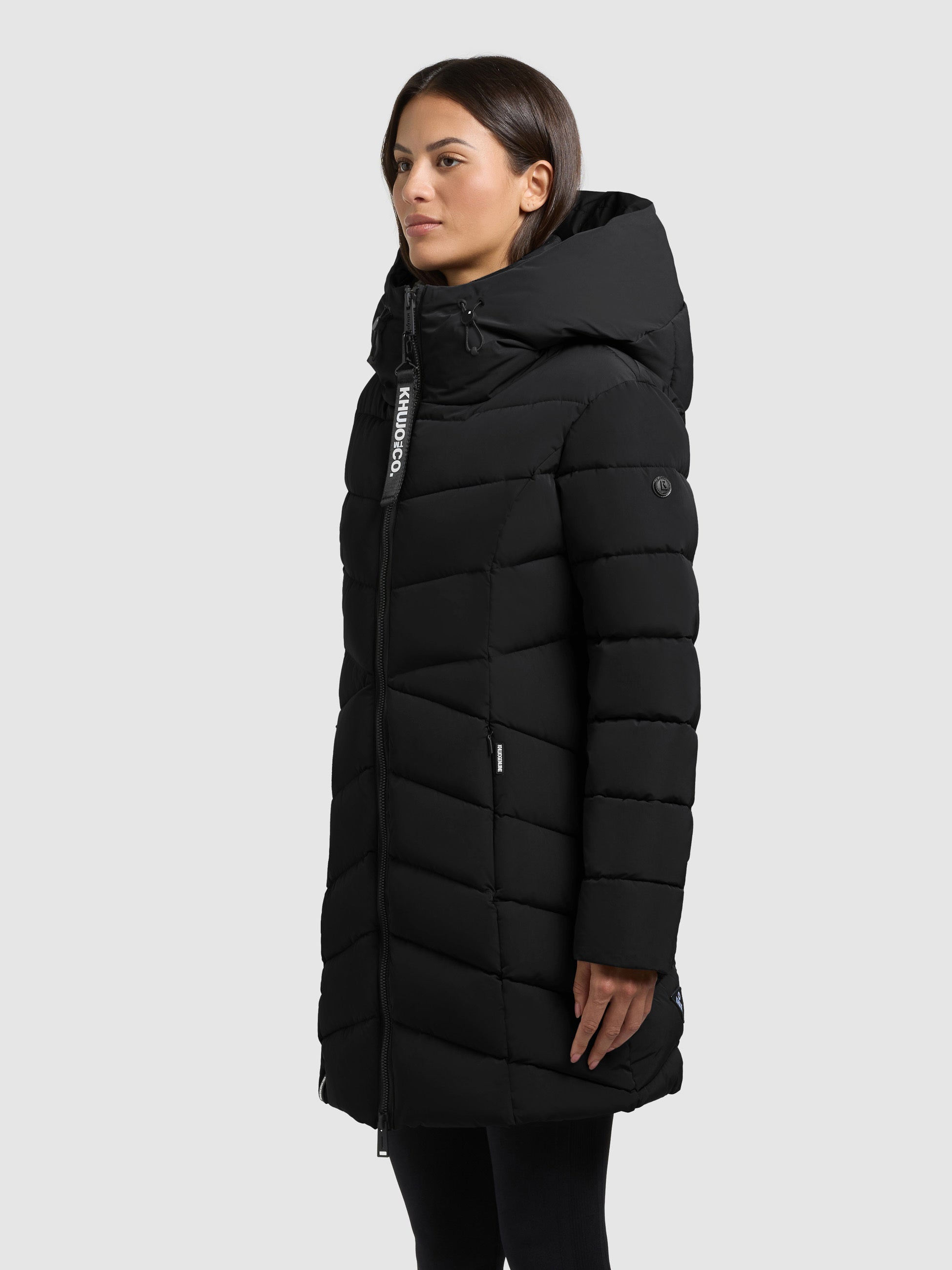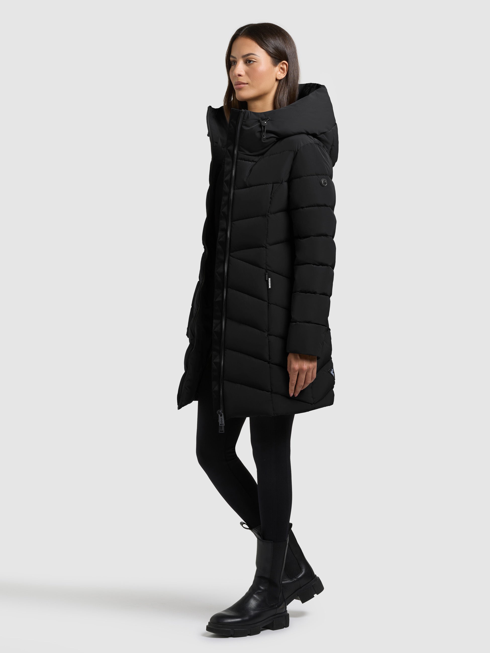 The khujo The coat DIER can be worn thanks to a padded and removable lining. The stand-up collar allows you to adapt perfectly to the weather. The quilted coat also features a large, high-closing hood and elasticated cuffs on the sleeve lining. You can store your essentials in a closable inner pocket and fleece-lined zippered seam pockets. An elasticated drawstring on the hood and princess seams complete the winter jacket.