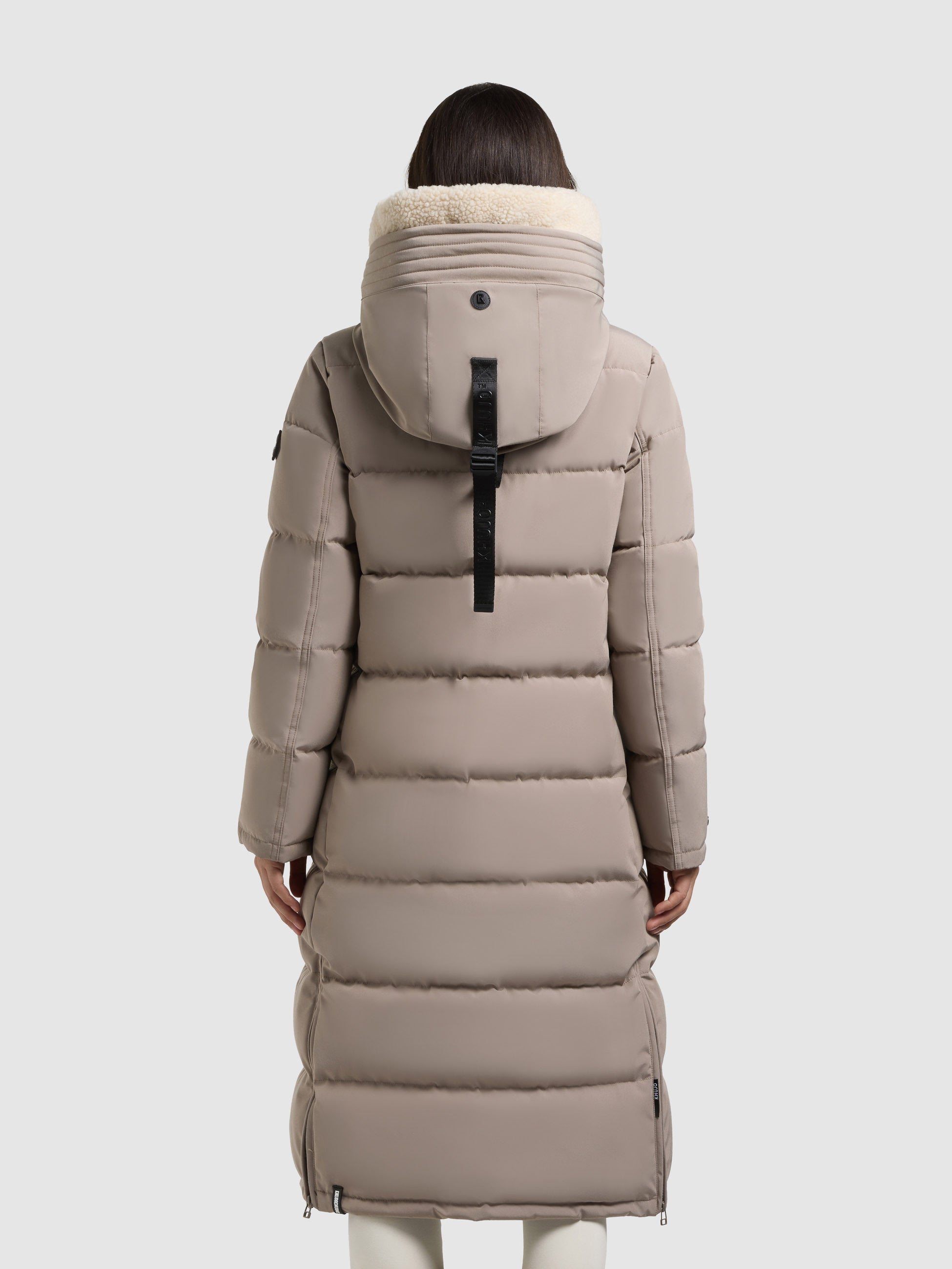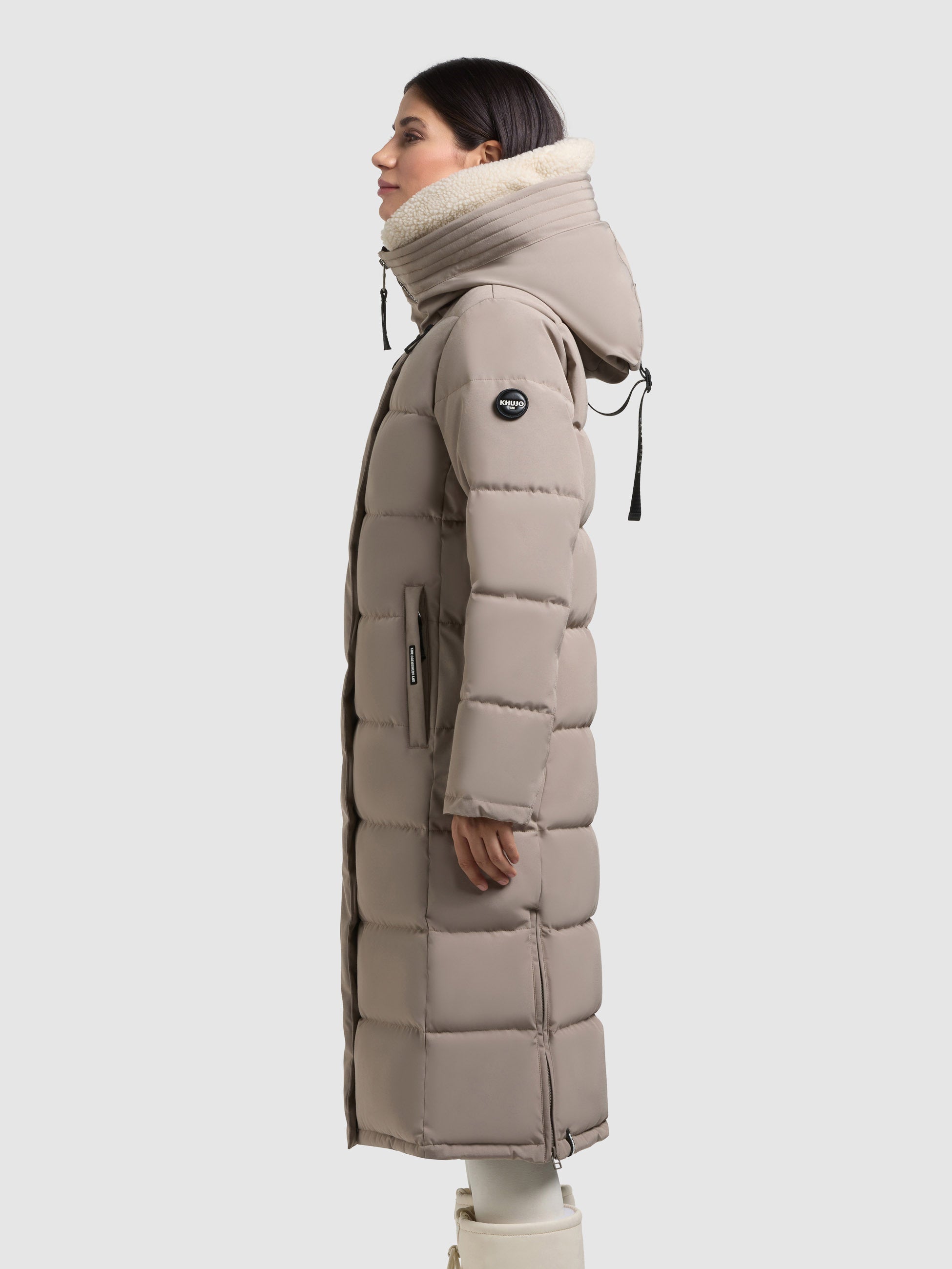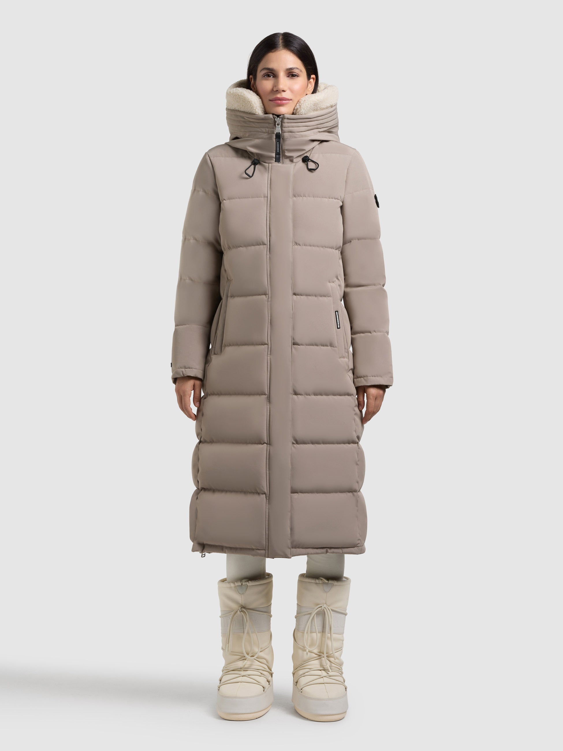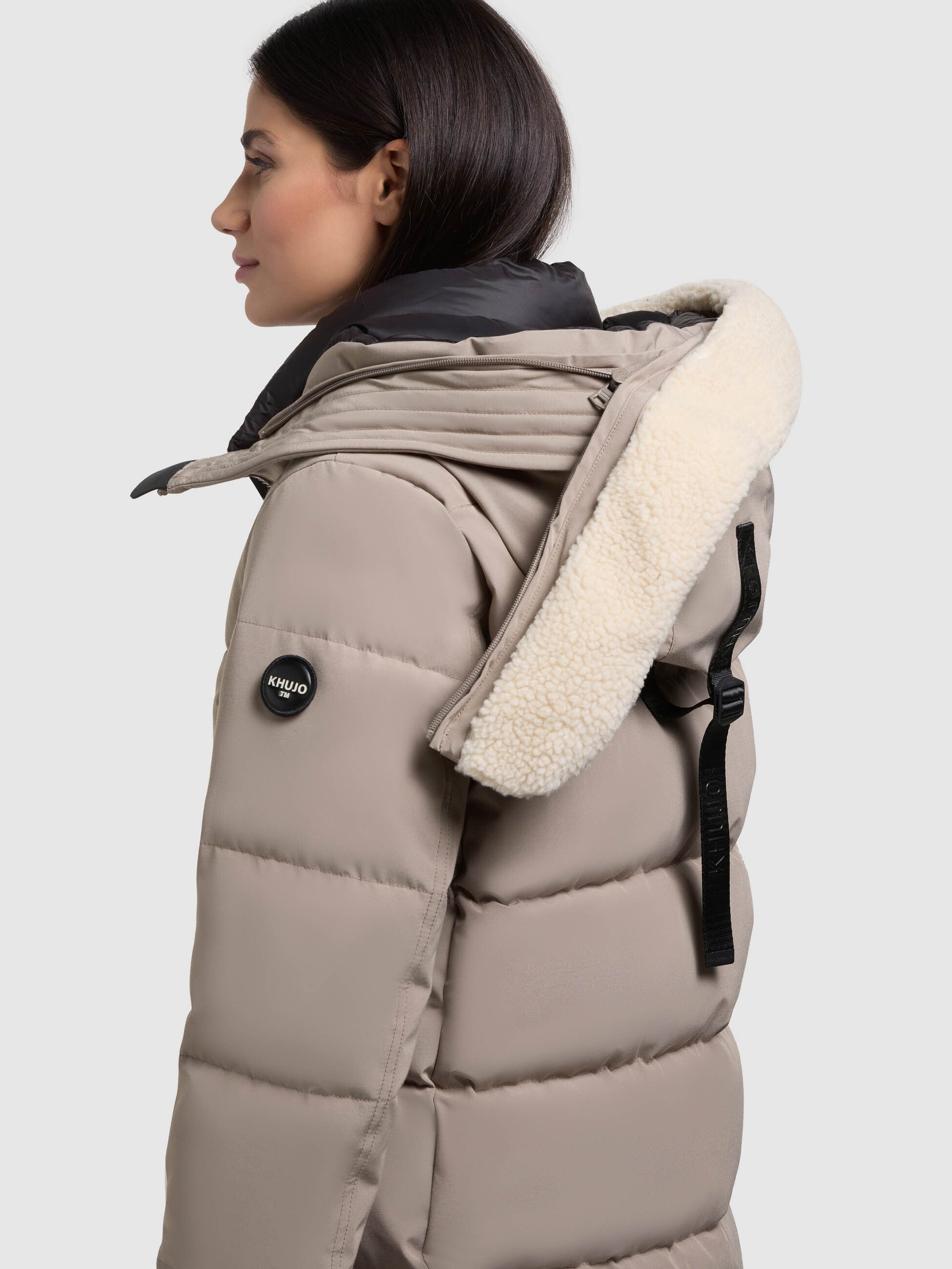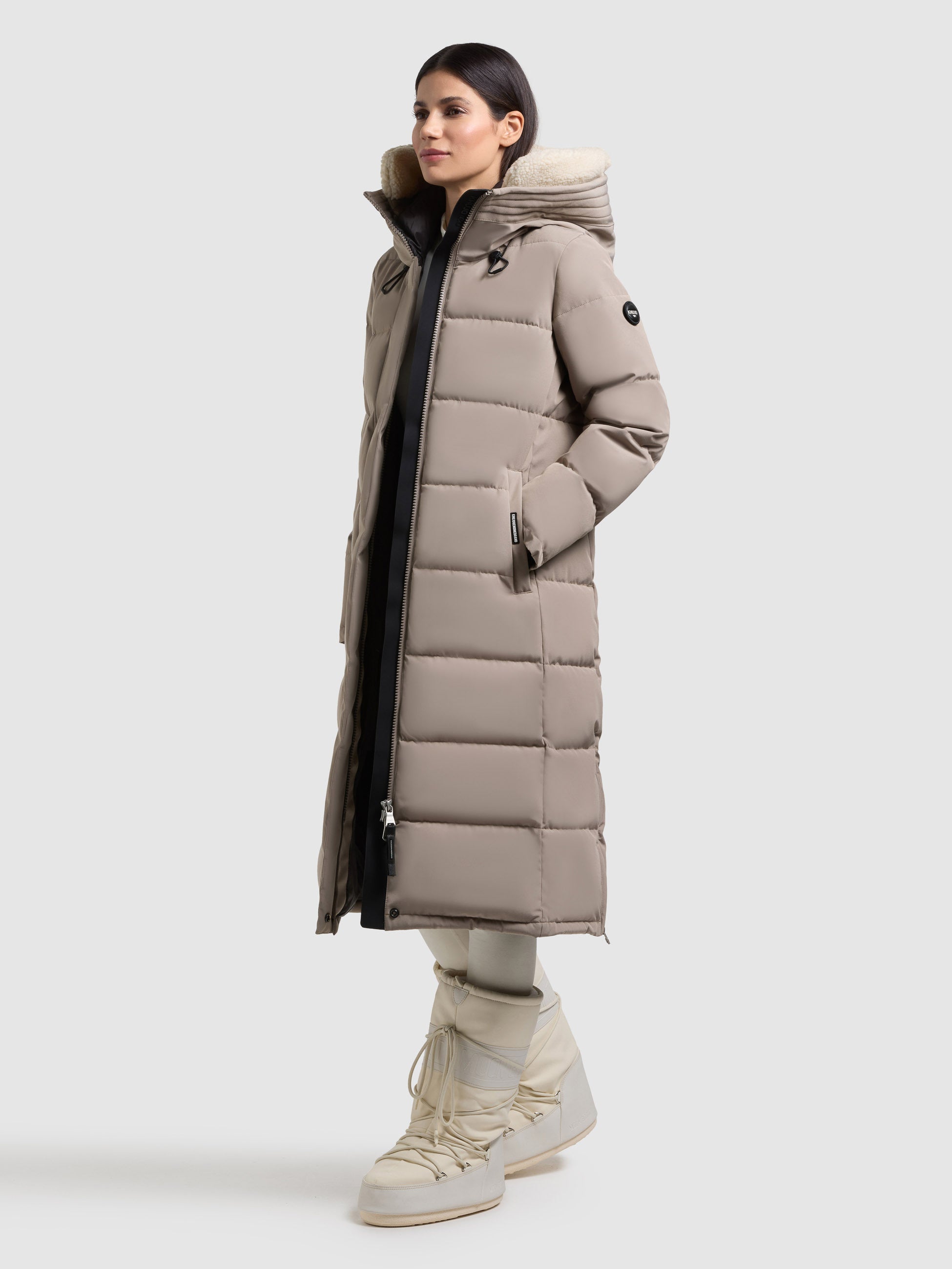 The knee-length khujo DARAS coat reliably protects against frosty temperatures and keeps you nice and warm thanks to a high-closing hood with detachable faux fur trim, elastic drawstring, and padded stand-up collar. This robust quilted coat features elastic ribbed cuffs on the sleeve lining, side slits, detachable backpack straps, a two-way zipper with a wind flap and magnetic closure, and fleece-lined zippered pockets for your essentials.