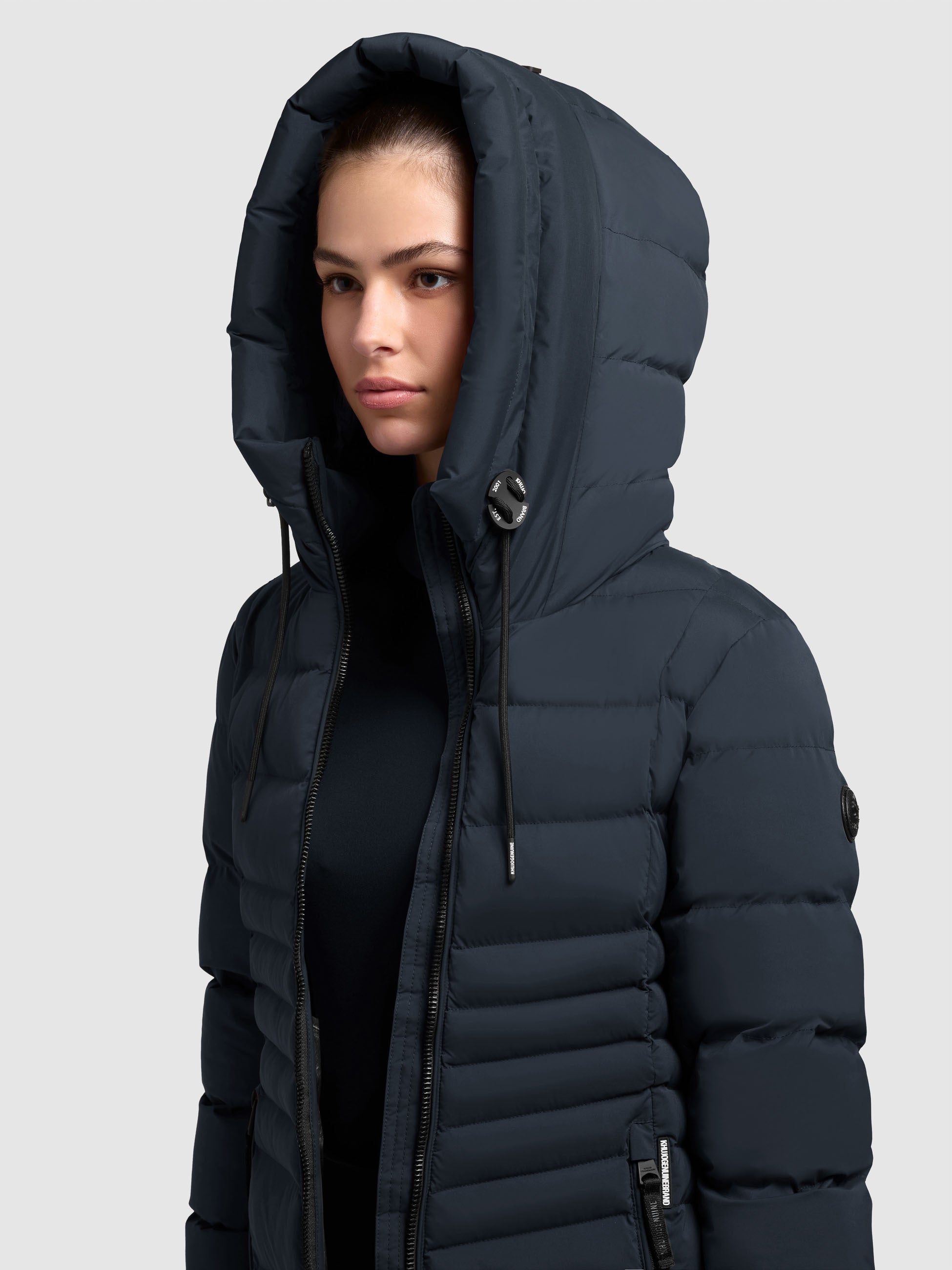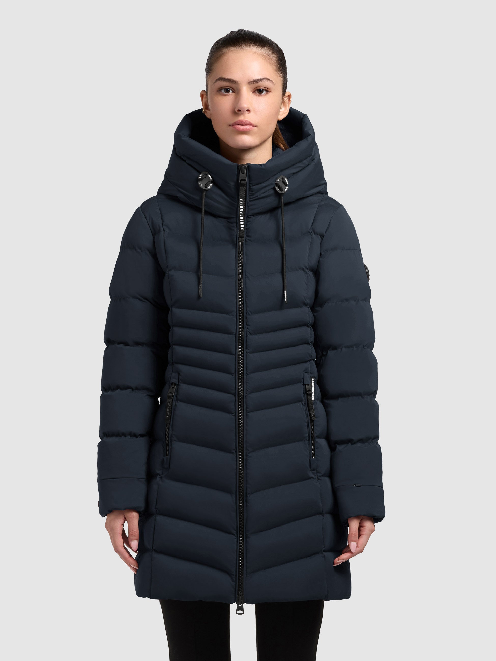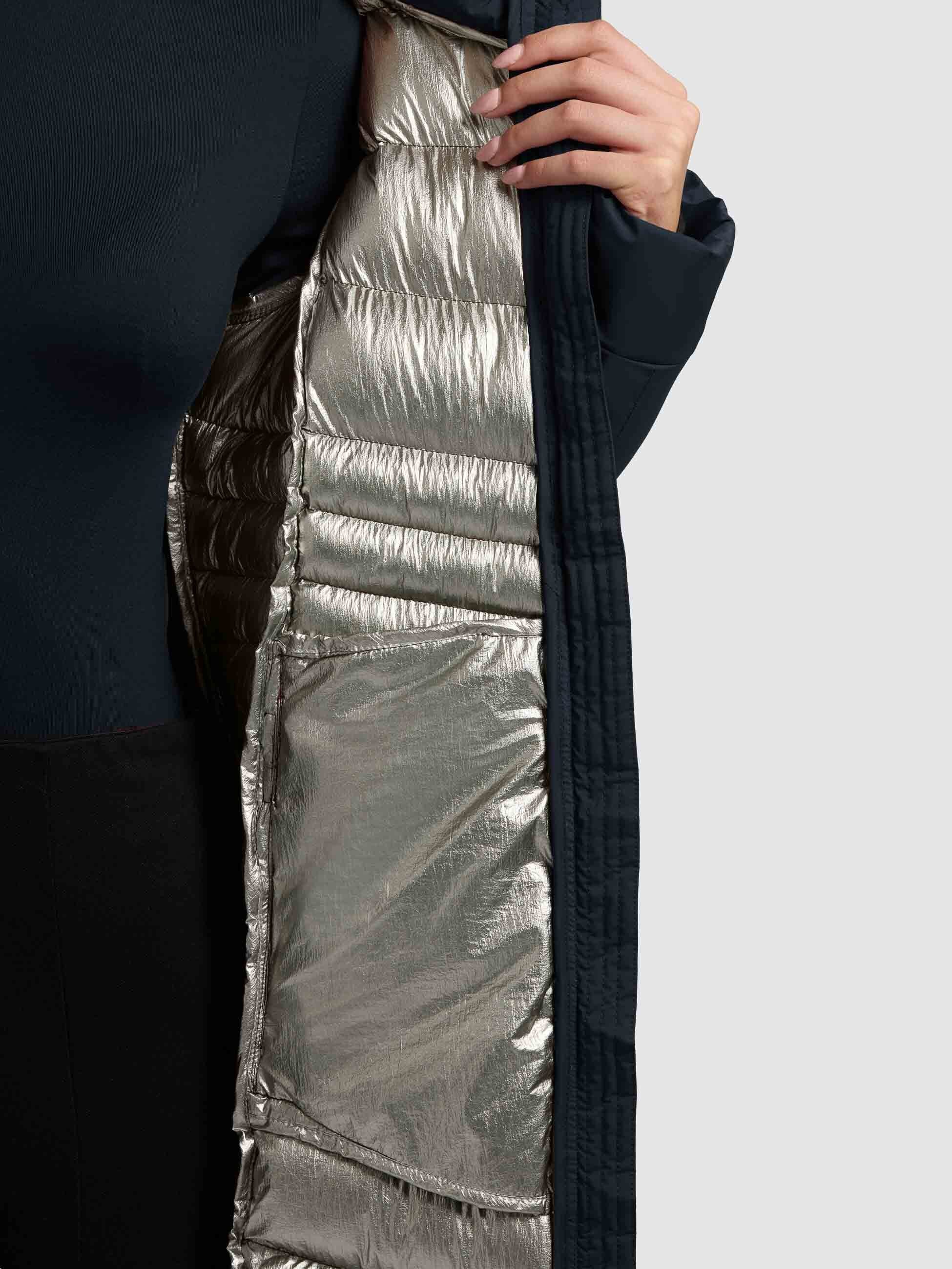 The slim-fit, lightly padded khujo LAVA coat, featuring a high-closing hood with drawstring, presents a minimalist yet sporty look. Thanks to a two-way zipper with a wind flap, fleece-lined zippered pockets, and elasticated cuffs on the sleeve lining, this short coat will have you perfectly equipped for the season. The shimmering silver lining and a hidden sleeve pocket complete the stylish design of this quilted jacket.