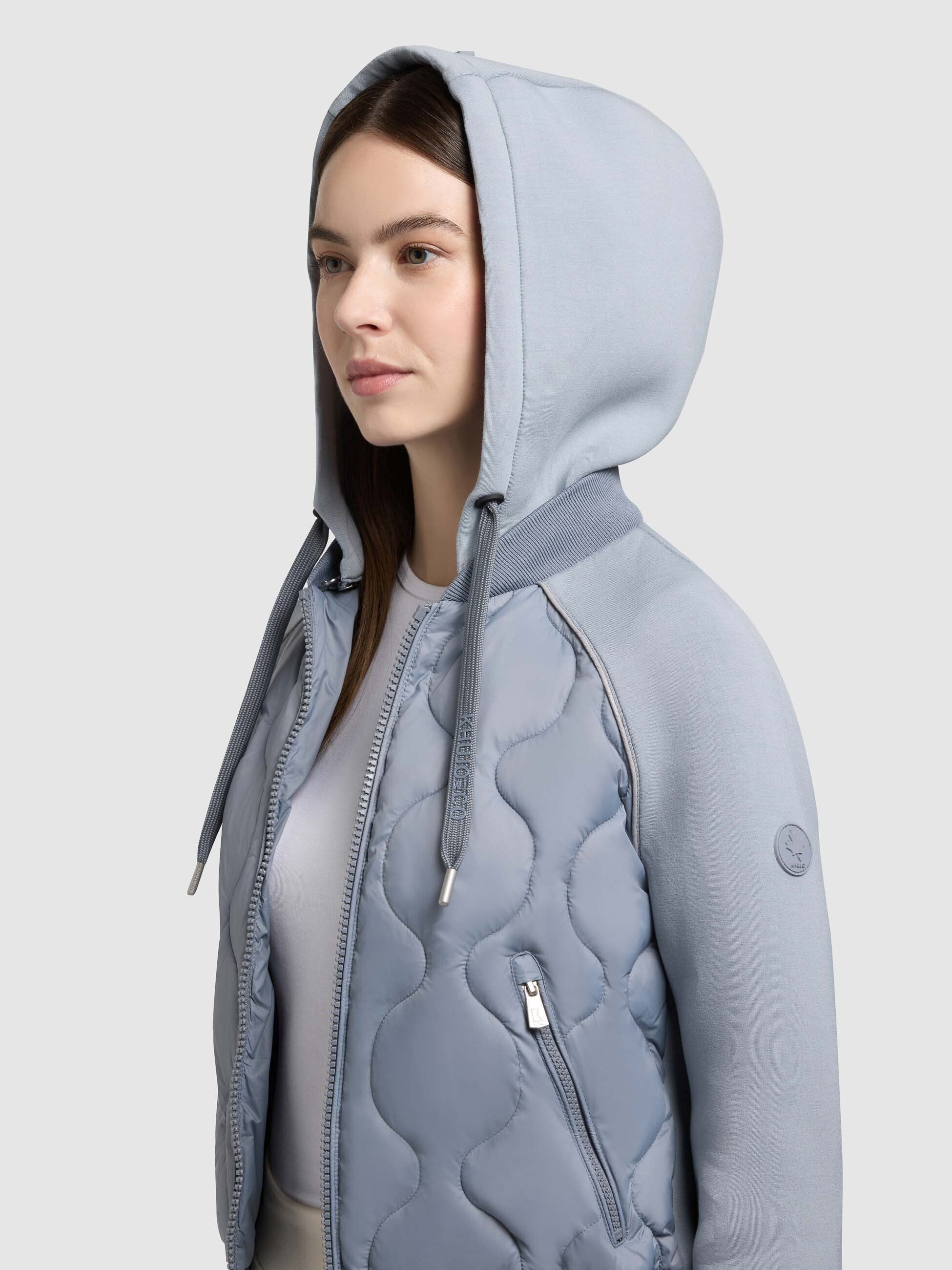 Perfekt für den Übergang oder für kühle Sommertage. Die kurz geschnittene khujo Jacke MALAYA begeistert mit ihrem Steppdesign, den Raglanärmeln sowie dem trendigen Materialmix. So befindet sich auf der Frontseite ein leichter, wasserabweisender Nylonstoff, während Kapuze, Ärmel und Rückseite aus einer neoprenähnlichen Qualität gefertigt sind. Die hoch schließende Kapuze ist mit Tunnelzug und Kordel verstellbar, die seitlichen Reißverschlusstaschen ergänzen das Modell.