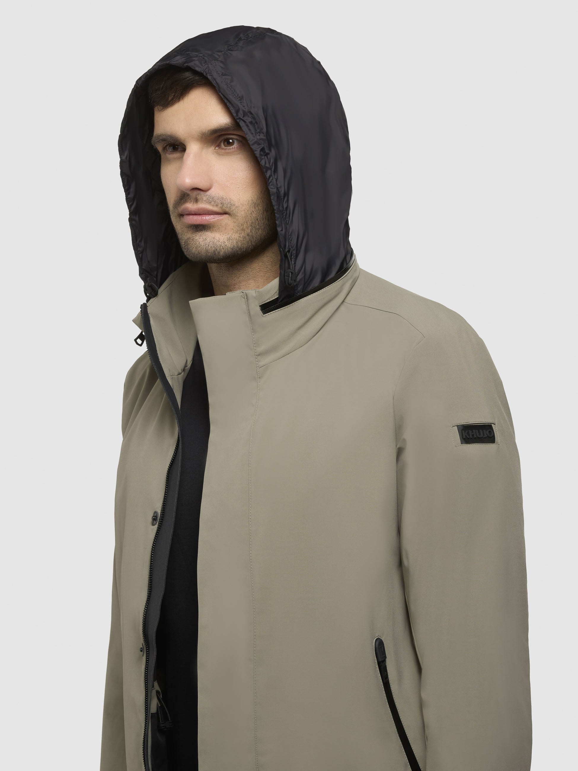 - Stowable hood with drawstring in the collar