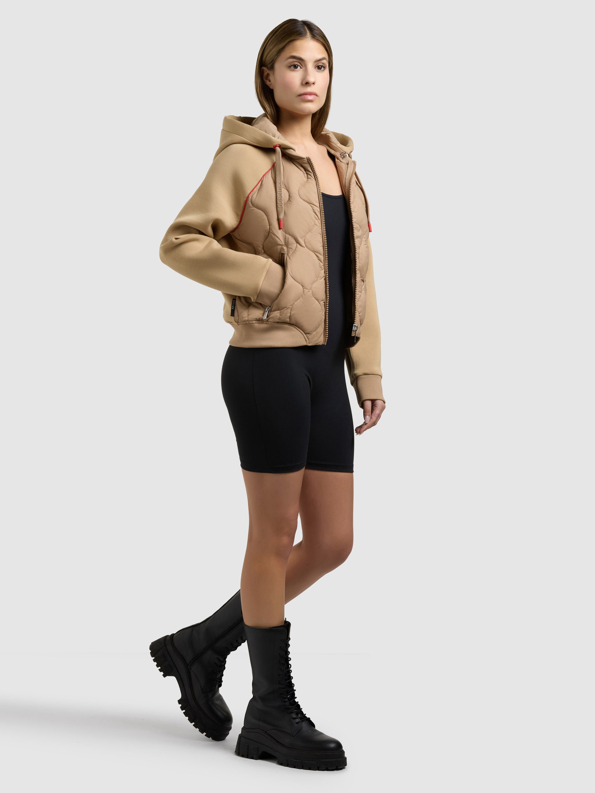 - hoch schließende Kapuze mit Kordelzug