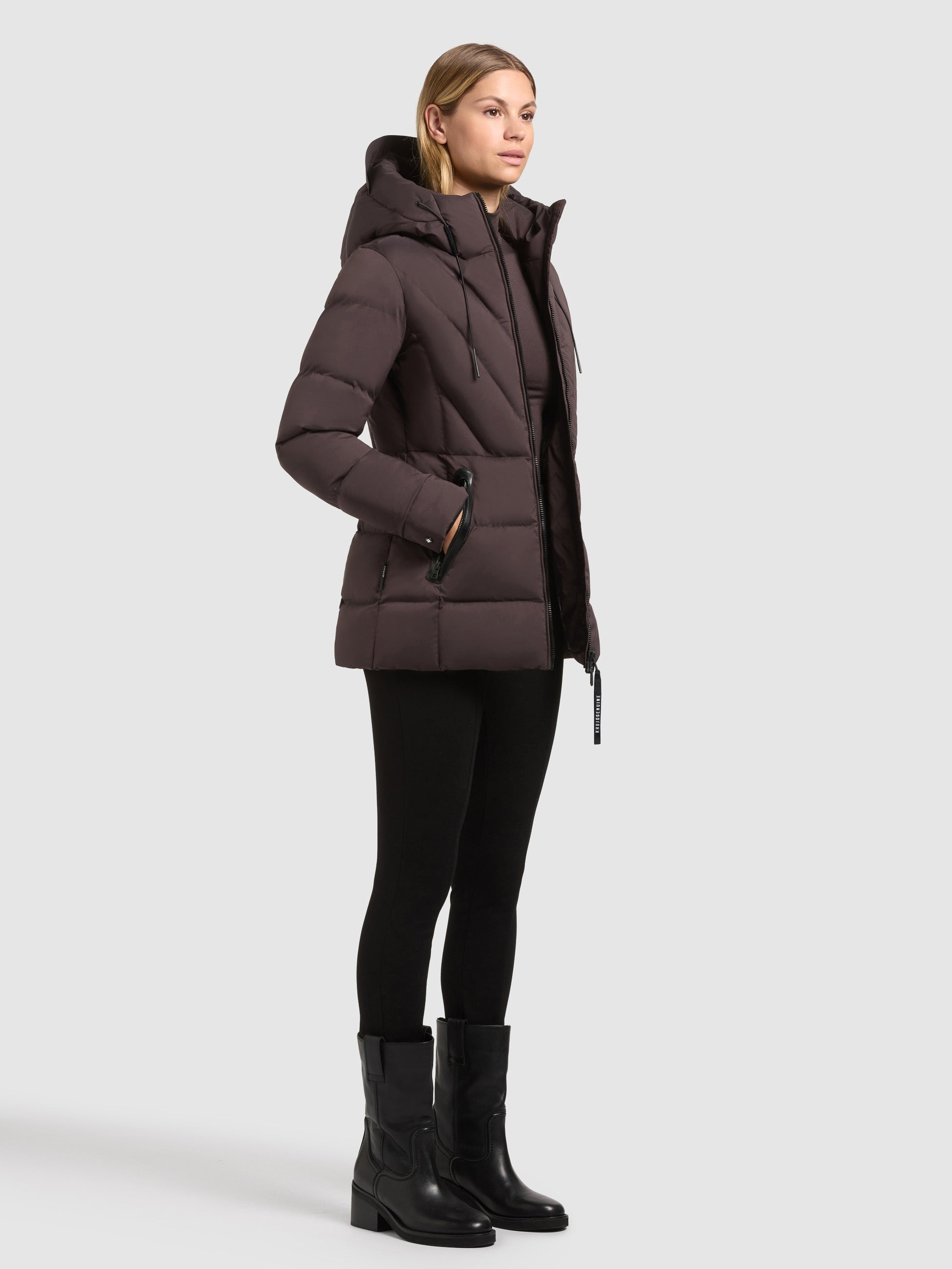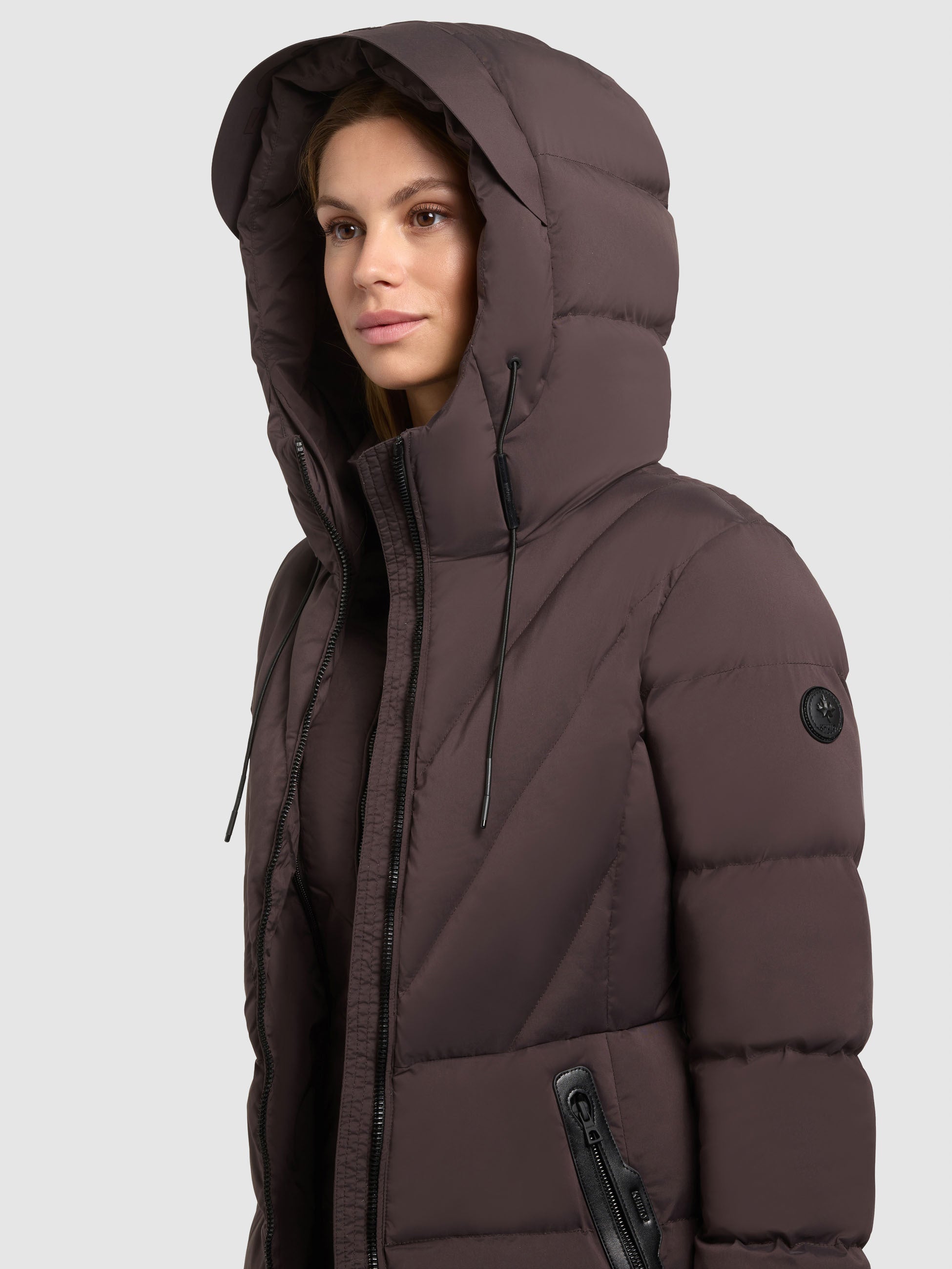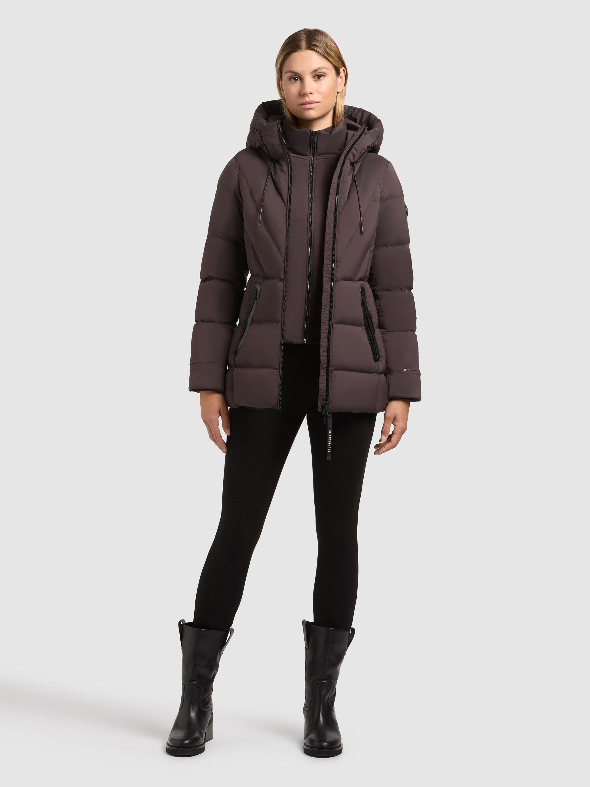 - hoch schließende Kapuze mit Kordelzug