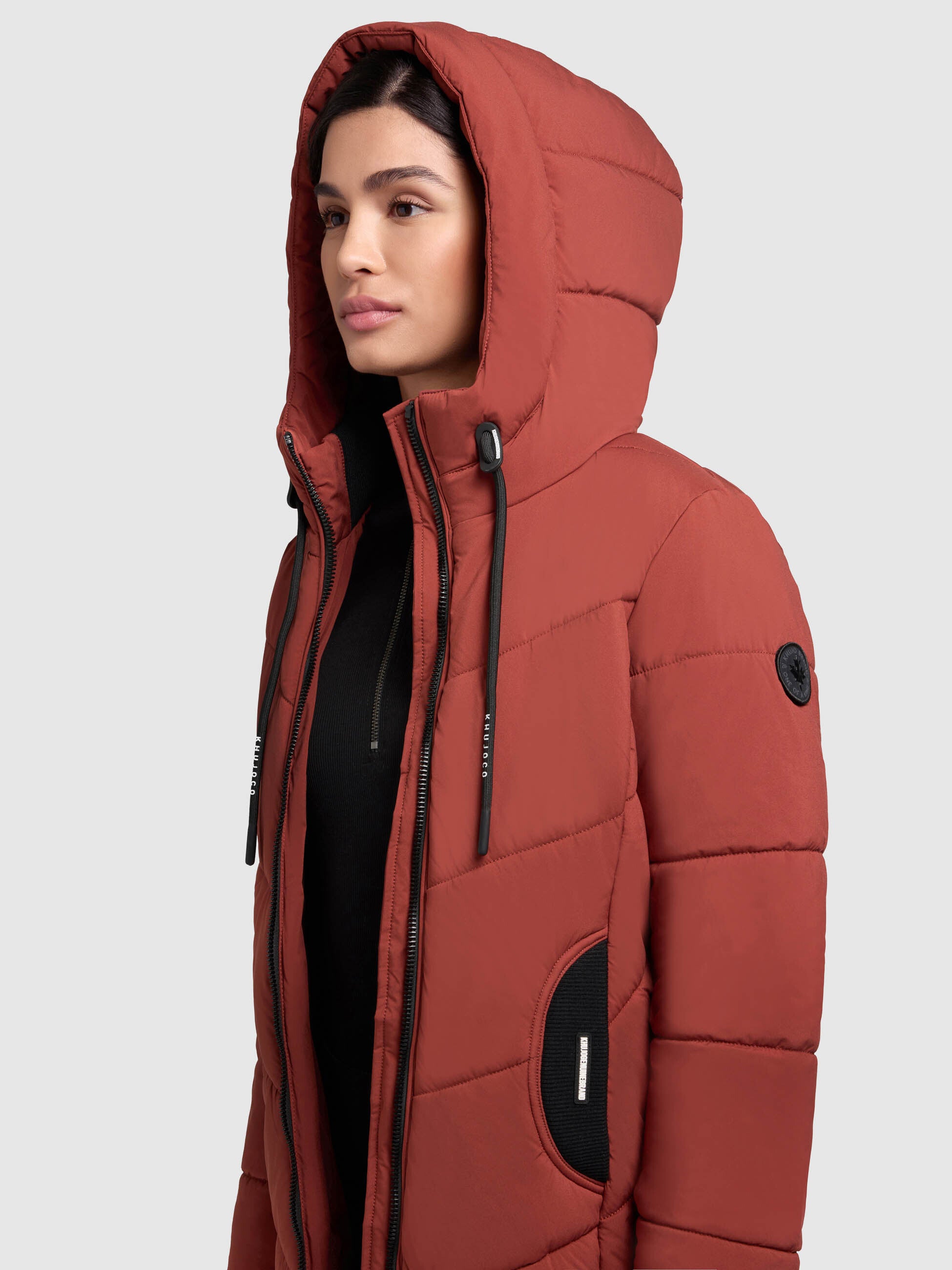 - hoch schließende Kapuze mit Kordelzug