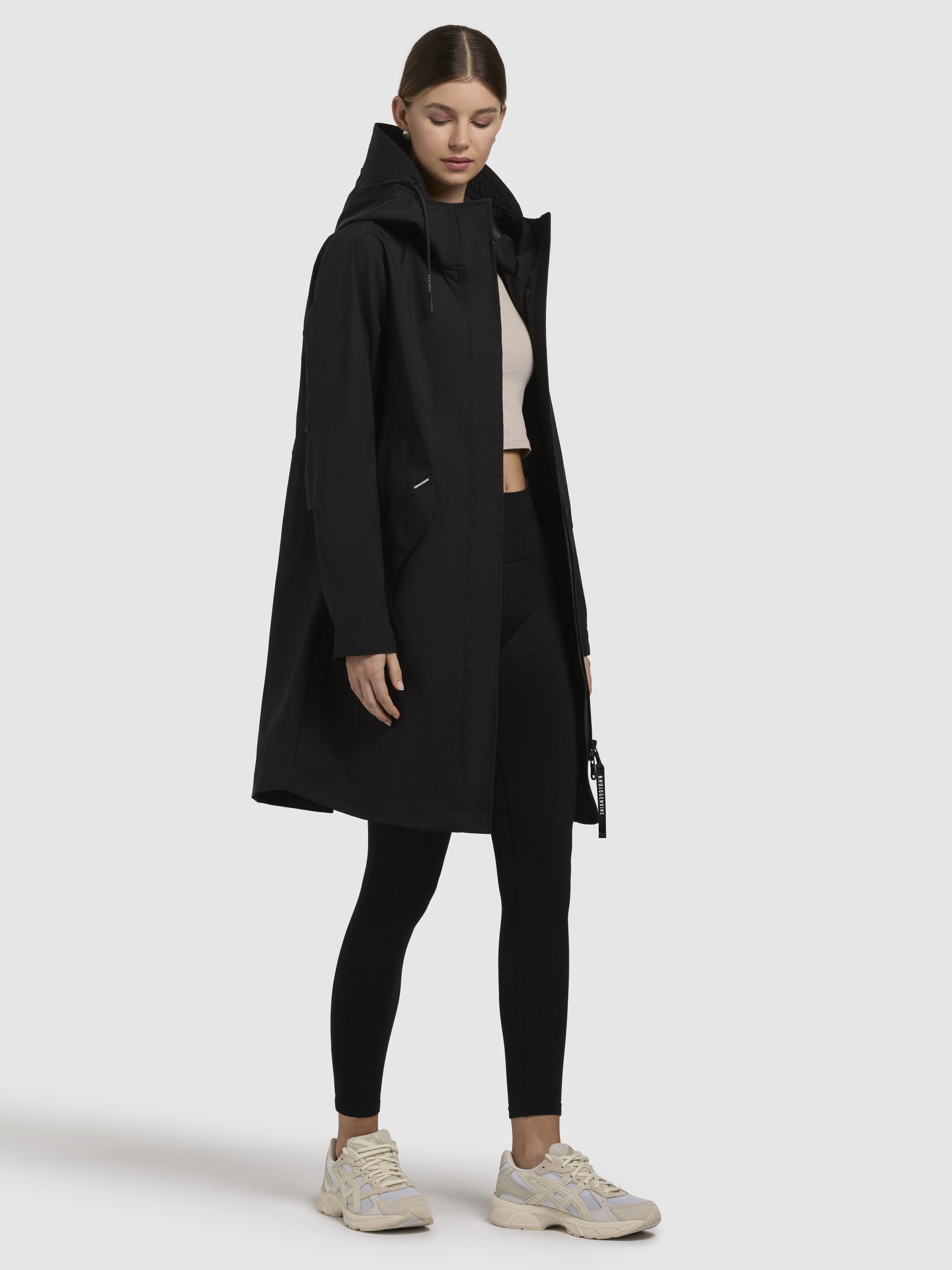 • Kordelzüge an Kapuze und Taille