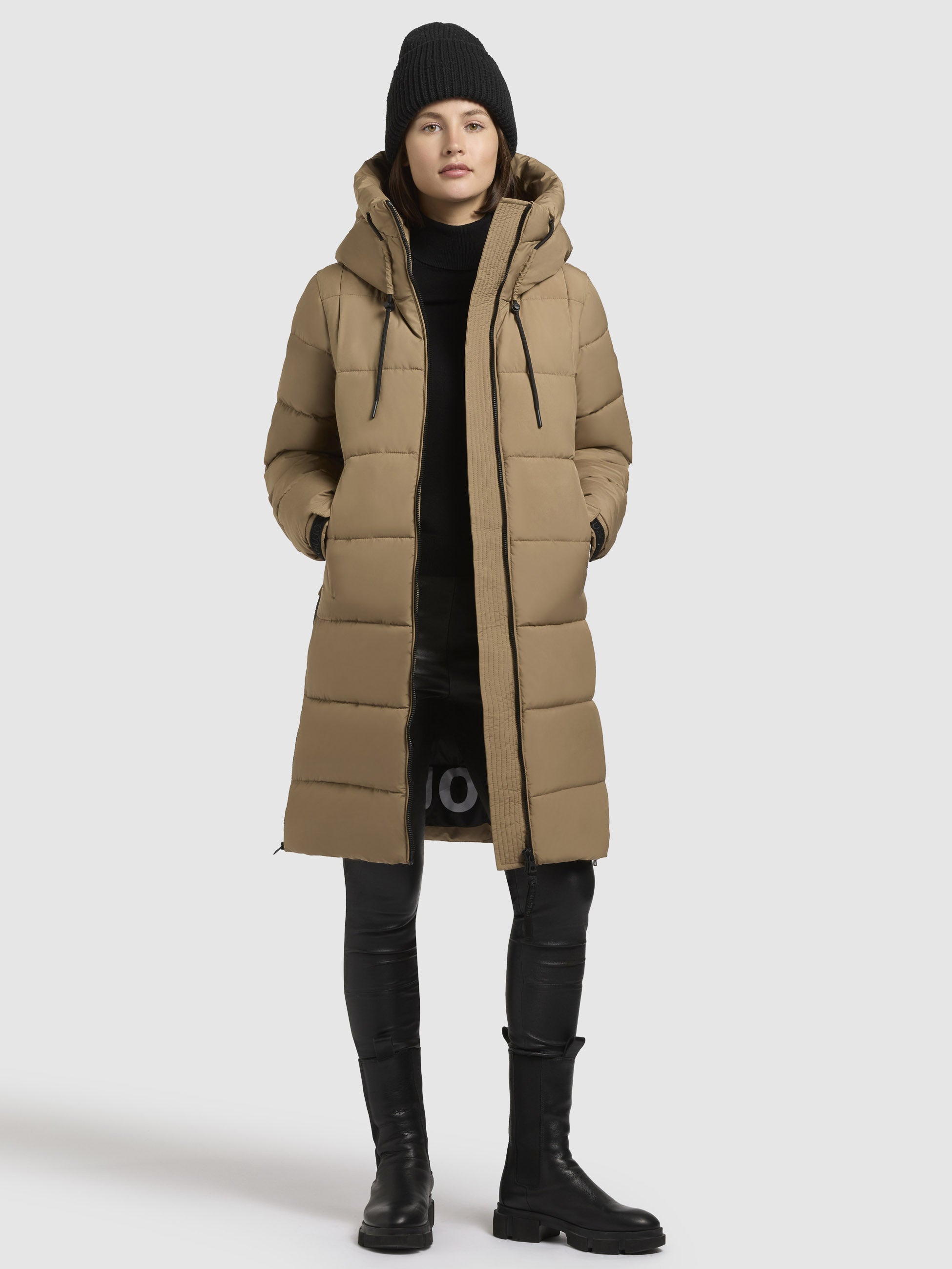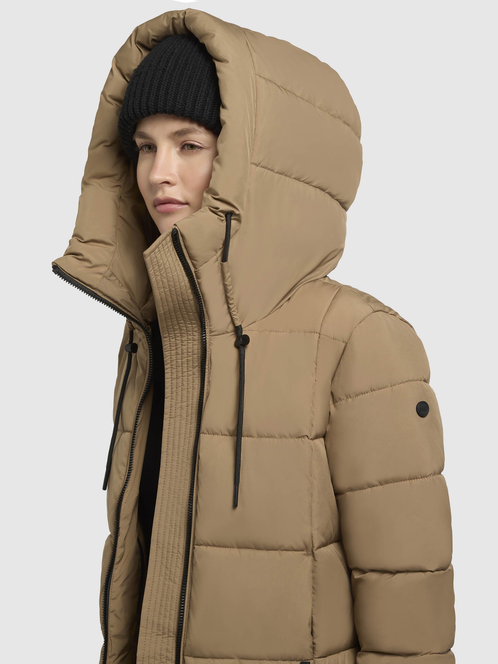 - hoch schließende Kapuze mit Kordelzug