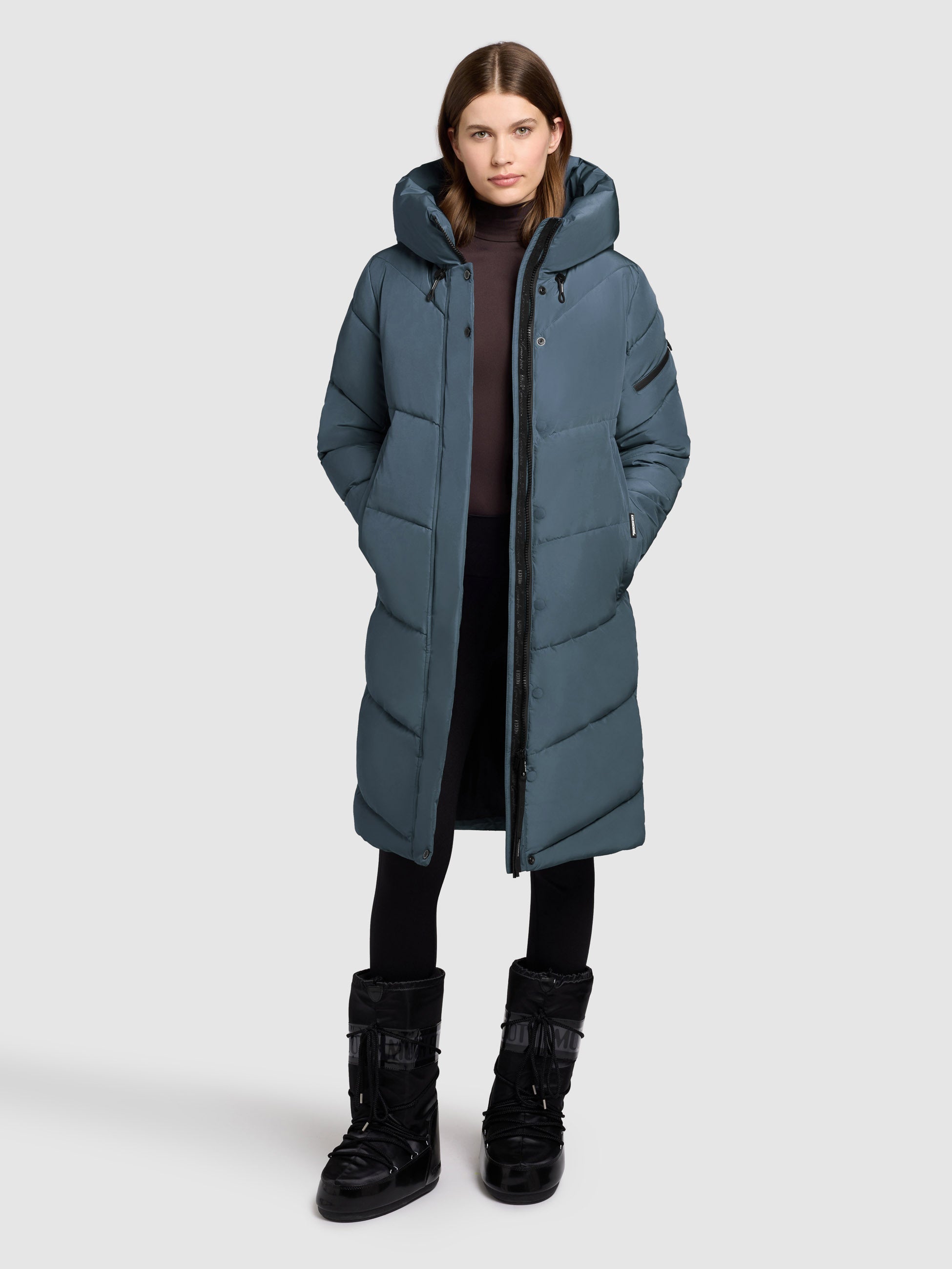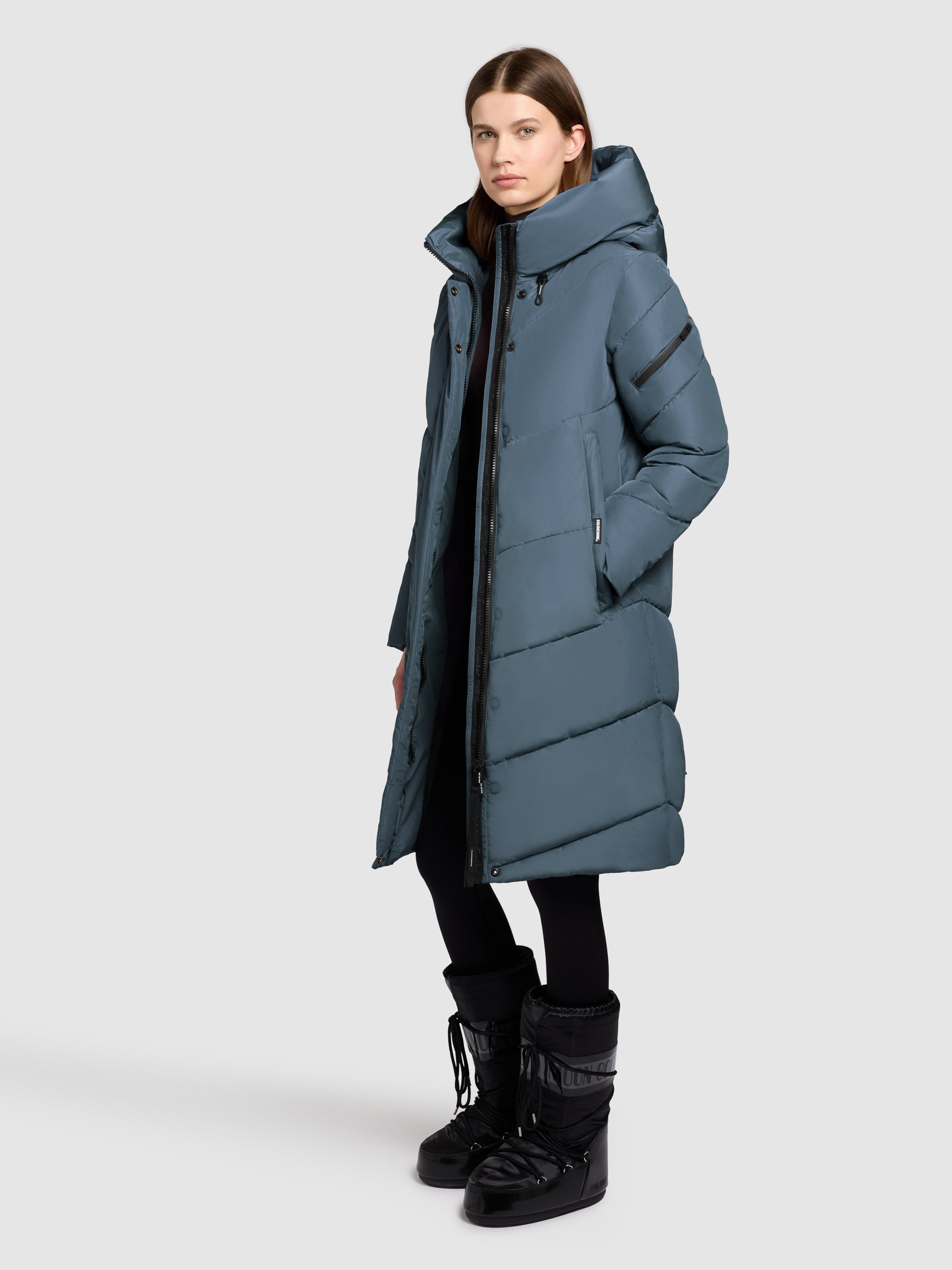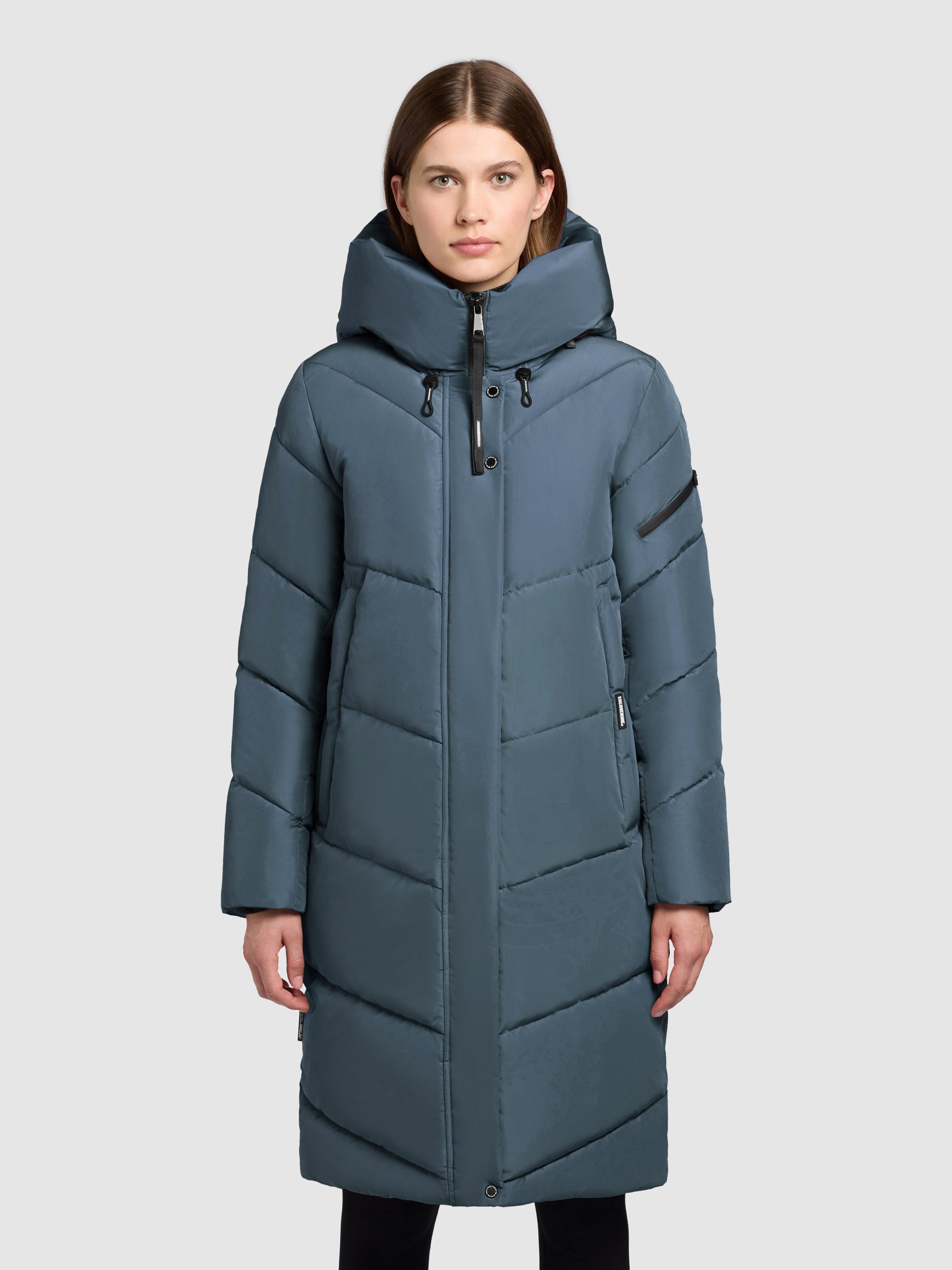 Eine hoch schließende Kapuze mit elastischem Kordelzug, eine warme Wattierung, elastische Bündchen am Ärmelfutter und Taschenbeutel mit Fleece schützen bei dem khujo Mantel JANGE vor kaltem Winterwetter. Dank des verkürzten Zwei-Wege-Reißverschlusses ist bei diesem knielangen Steppmantel Bewegungsfreiheit garantiert. Dein Hab und Gut kann zudem in den seitlichen Reißverschlusstaschen, einer Innentasche, oder einer wasserabweisenden Tasche am Ärmel dieser Winterjacke verstaut werden.