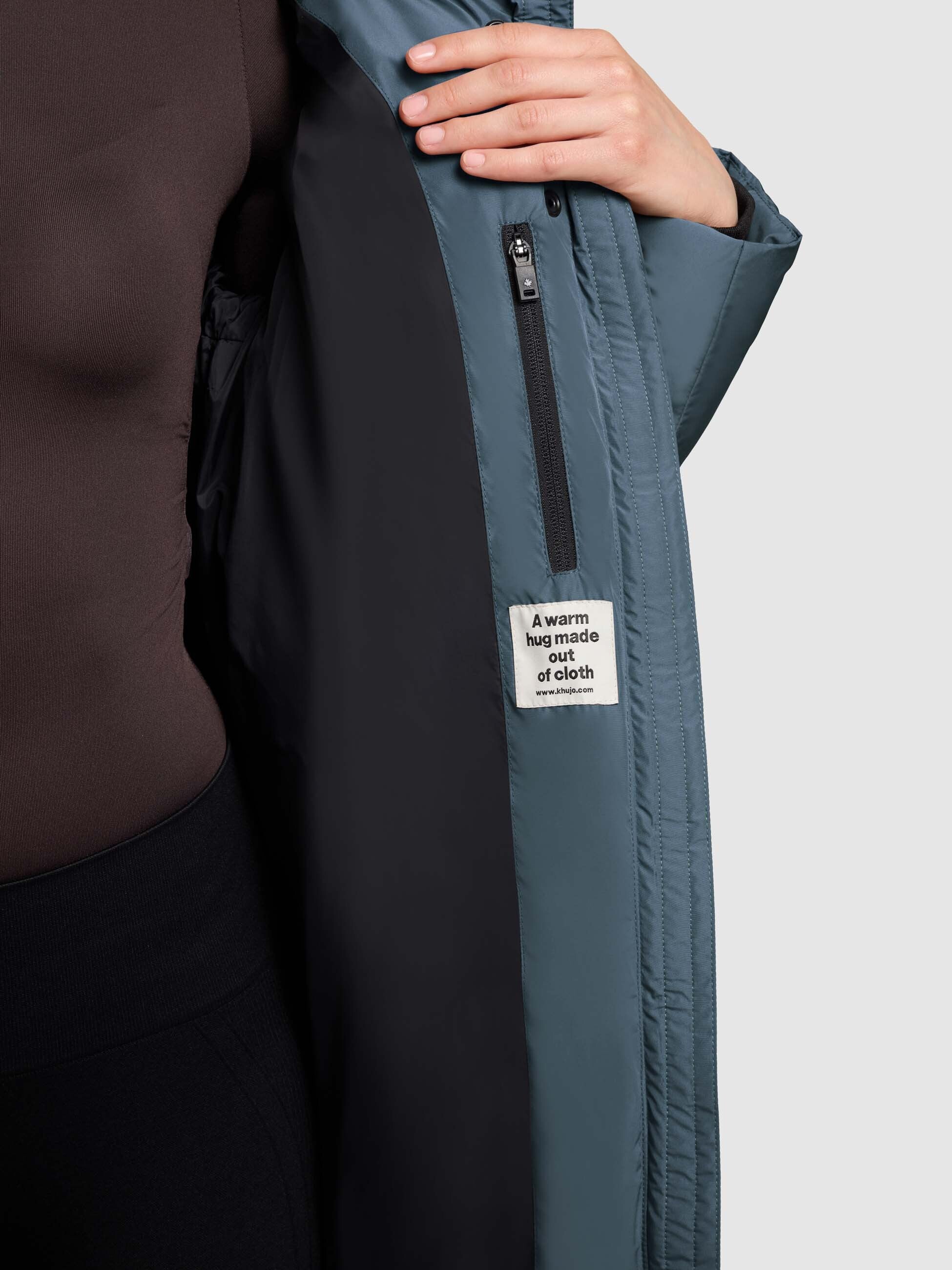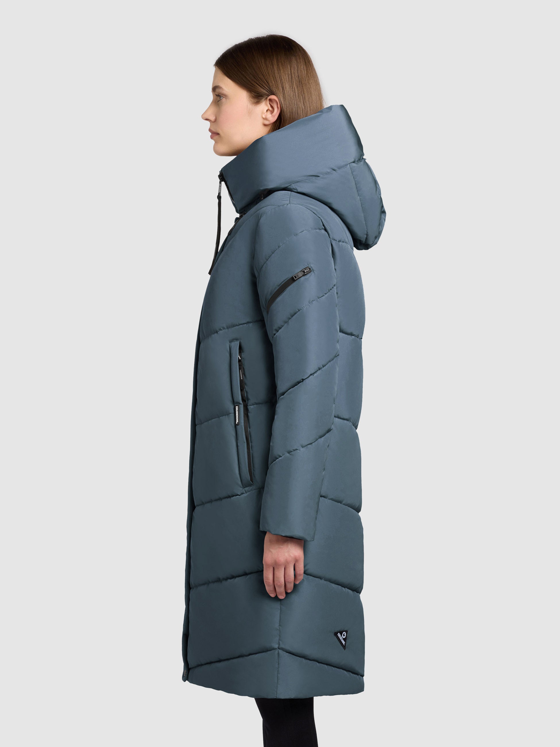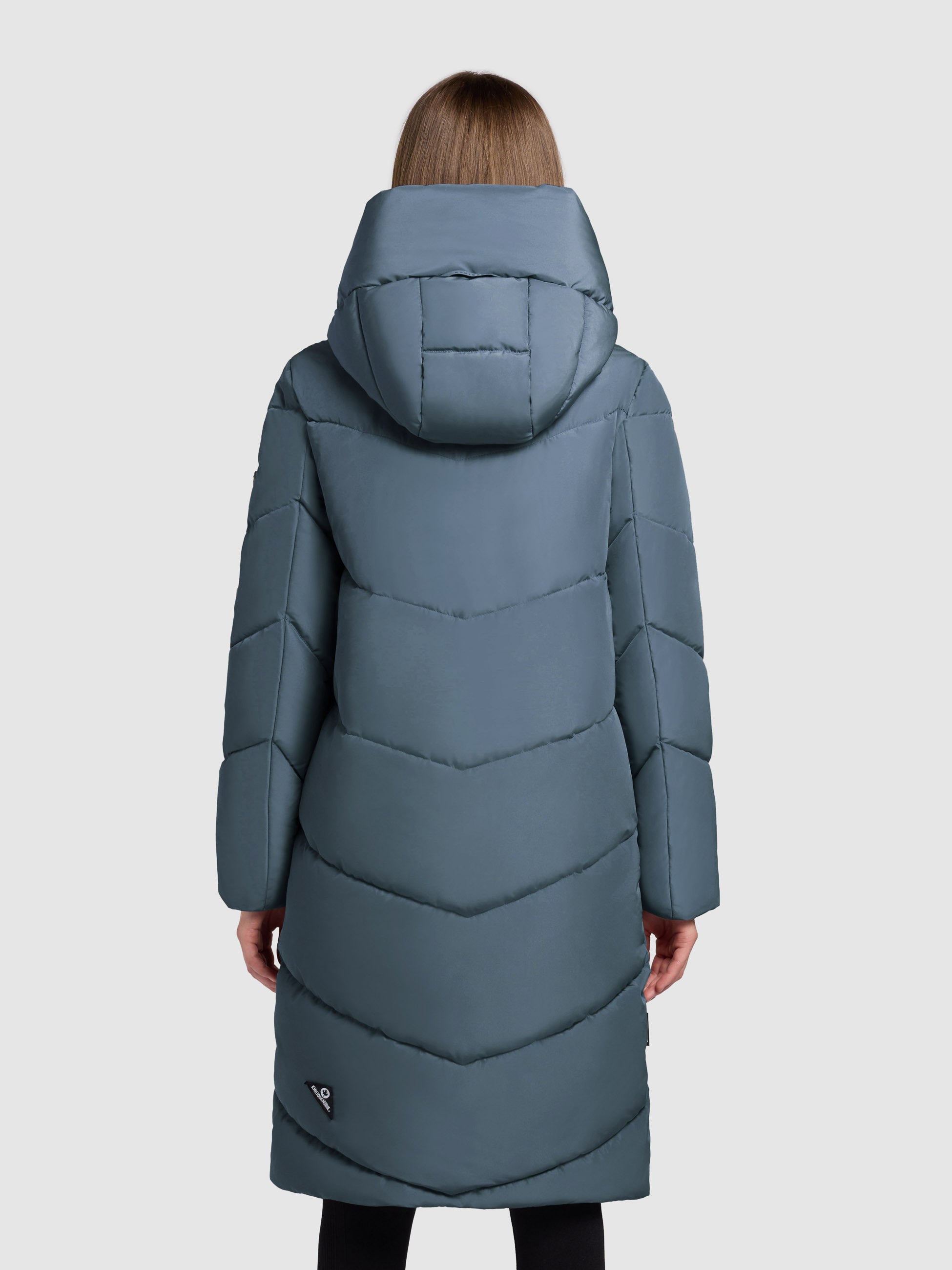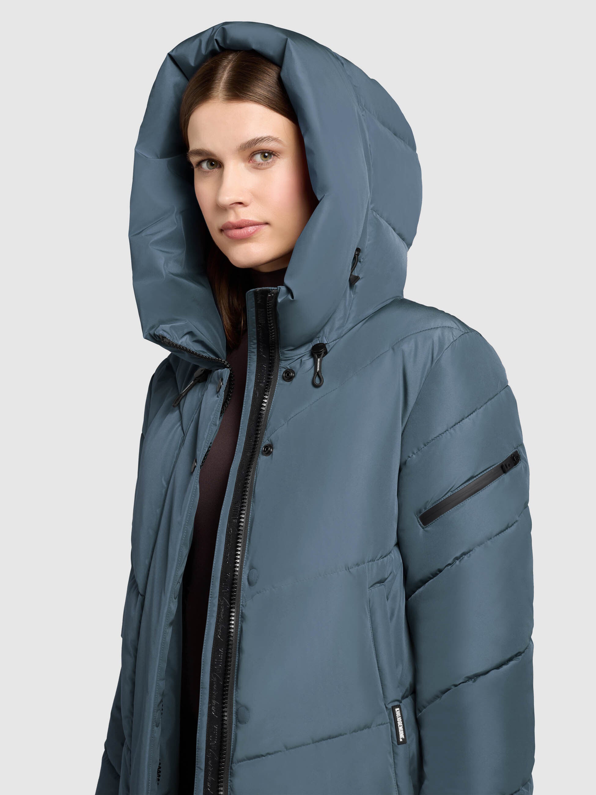 Eine hoch schließende Kapuze mit elastischem Kordelzug, eine warme Wattierung, elastische Bündchen am Ärmelfutter und Taschenbeutel mit Fleece schützen bei dem khujo Mantel JANGE vor kaltem Winterwetter. Dank des verkürzten Zwei-Wege-Reißverschlusses ist bei diesem knielangen Steppmantel Bewegungsfreiheit garantiert. Dein Hab und Gut kann zudem in den seitlichen Reißverschlusstaschen, einer Innentasche, oder einer wasserabweisenden Tasche am Ärmel dieser Winterjacke verstaut werden.