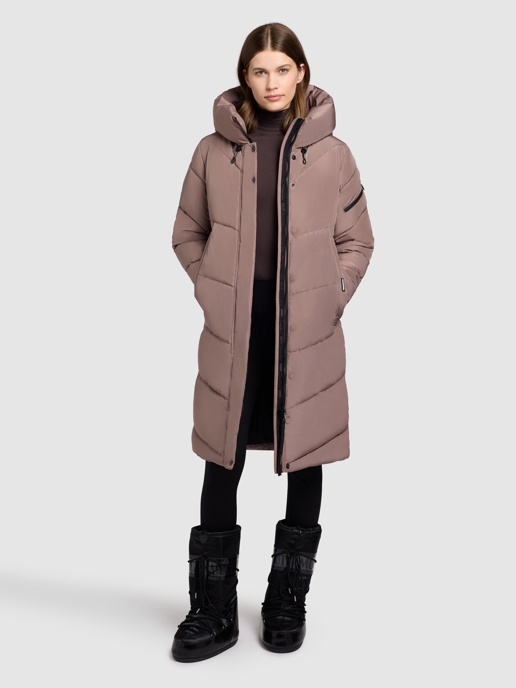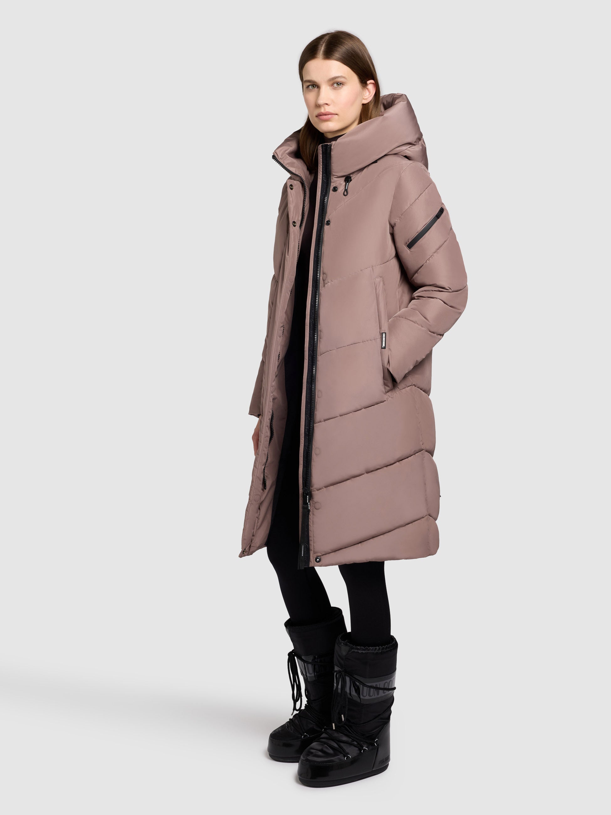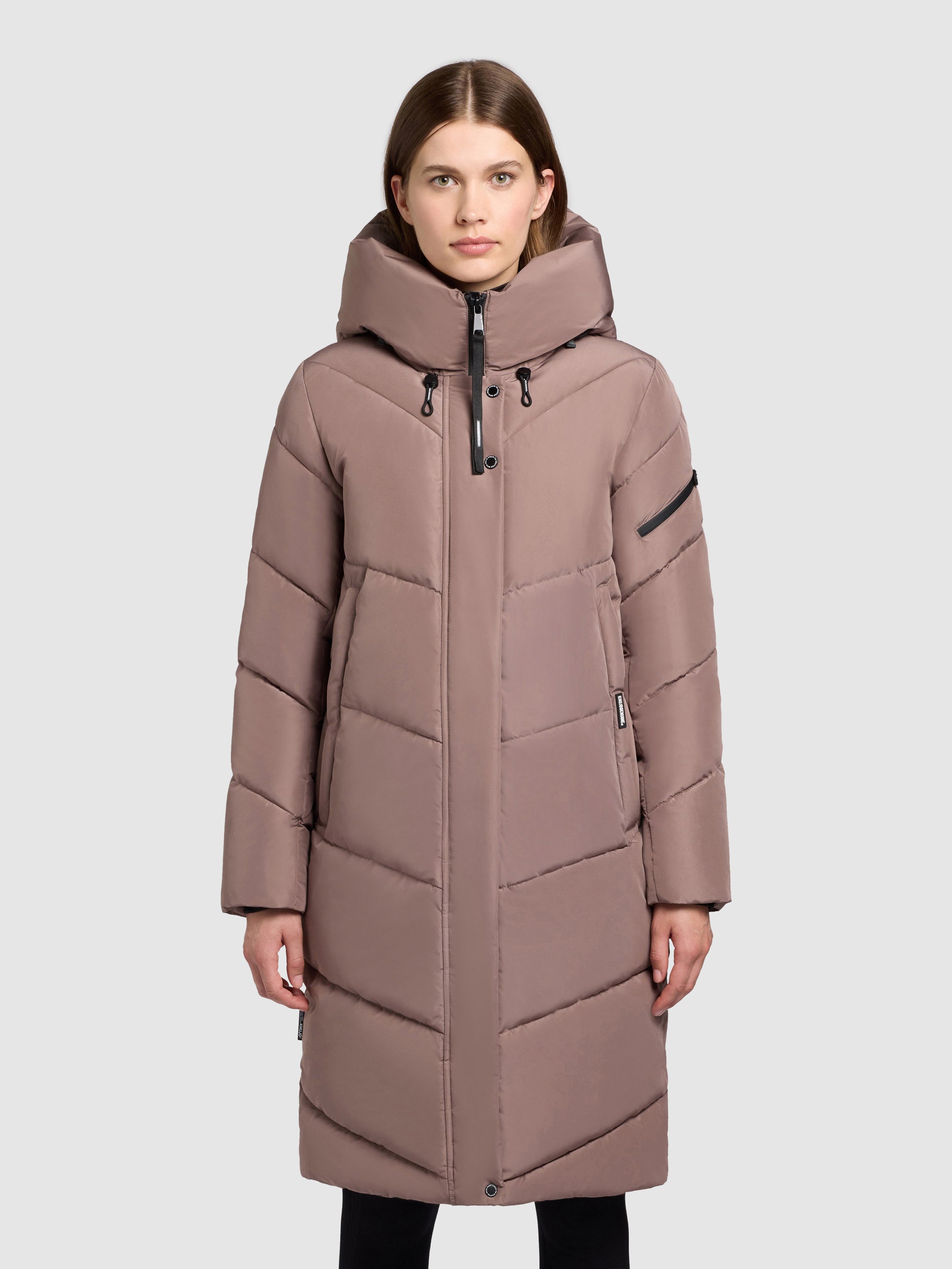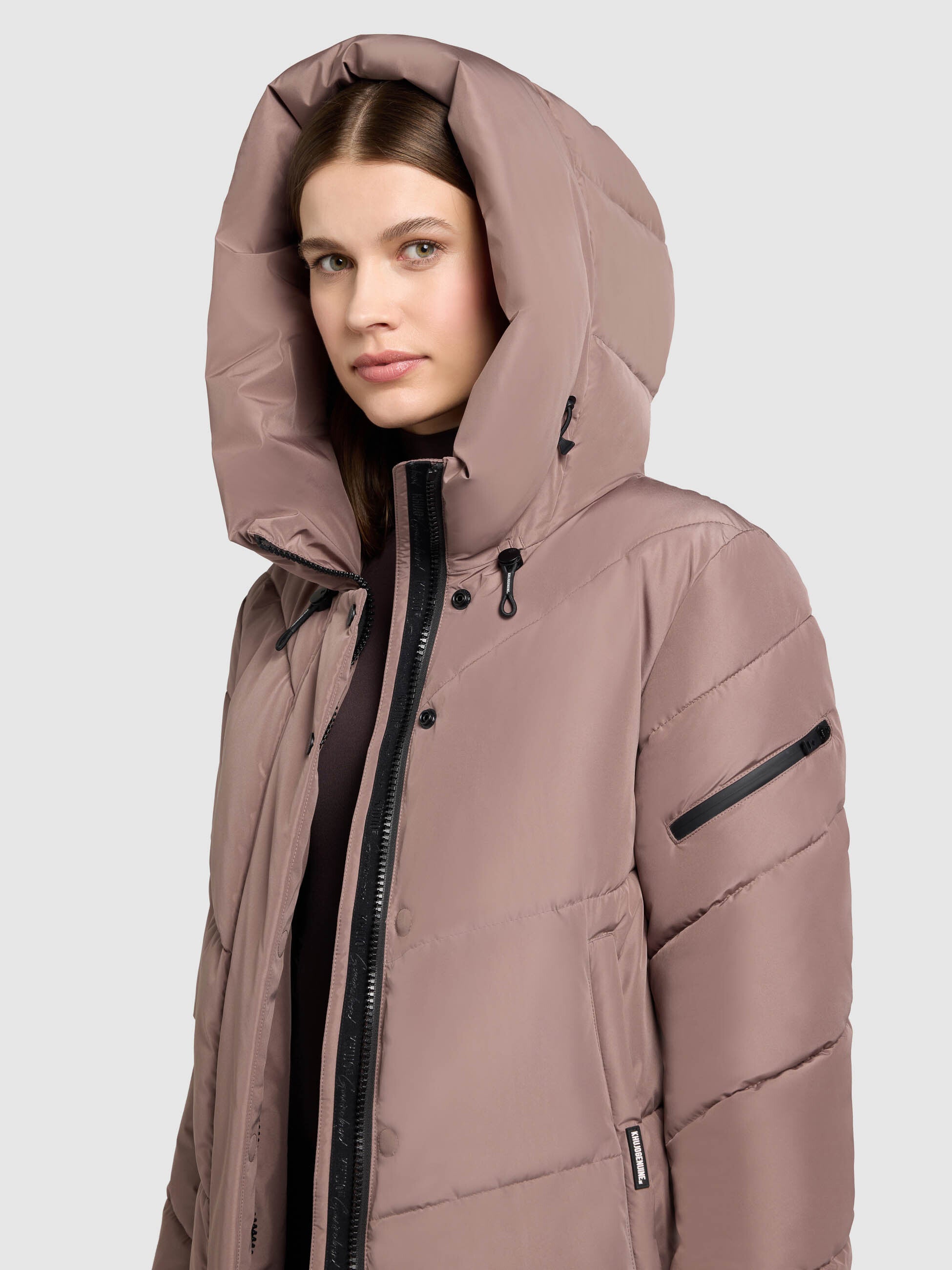 Eine hoch schließende Kapuze mit elastischem Kordelzug, eine warme Wattierung, elastische Bündchen am Ärmelfutter und Taschenbeutel mit Fleece schützen bei dem khujo Mantel JANGE vor kaltem Winterwetter. Dank des verkürzten Zwei-Wege-Reißverschlusses ist bei diesem knielangen Steppmantel Bewegungsfreiheit garantiert. Dein Hab und Gut kann zudem in den seitlichen Reißverschlusstaschen, einer Innentasche, oder einer wasserabweisenden Tasche am Ärmel dieser Winterjacke verstaut werden.