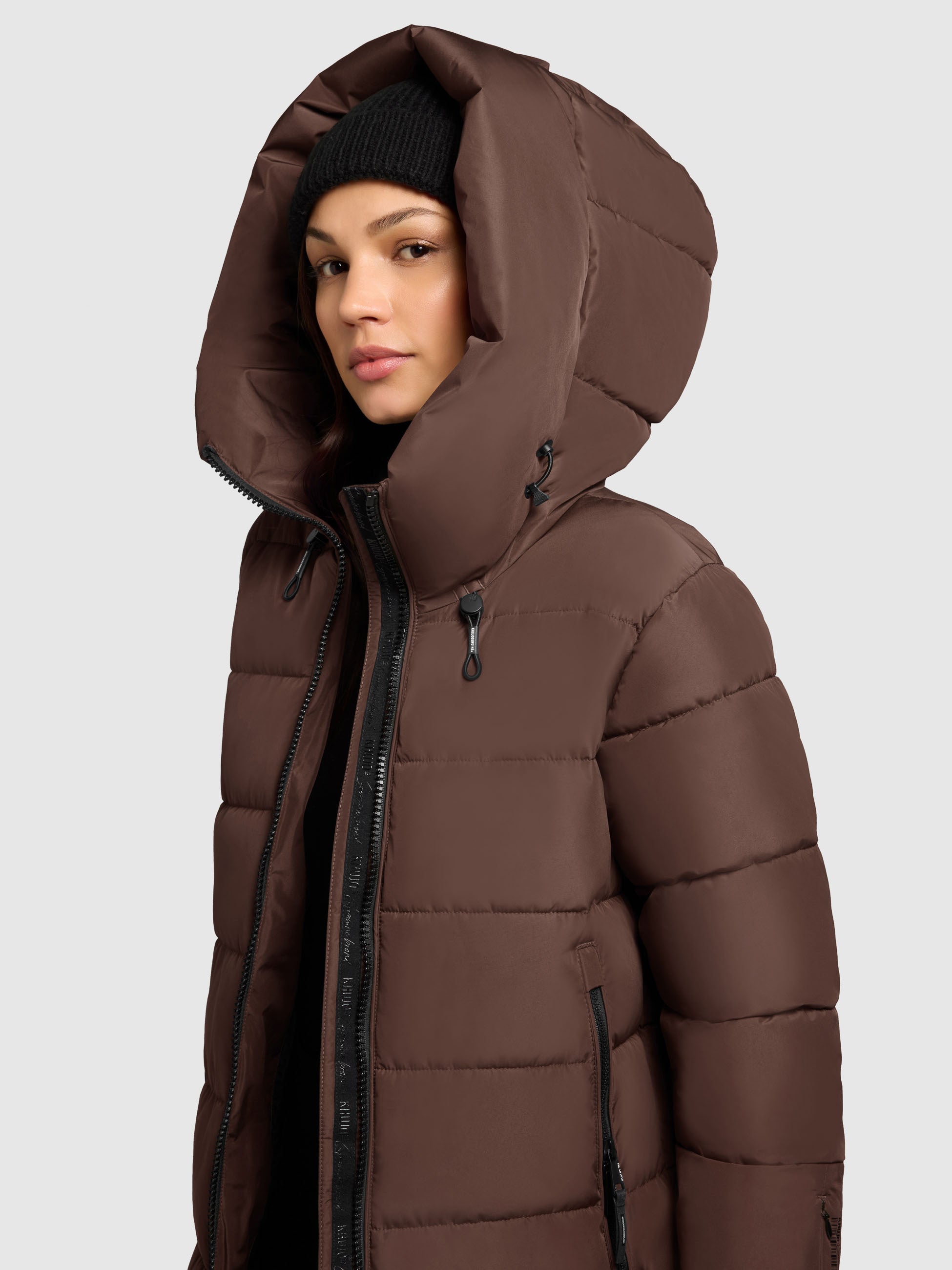 - hoch schließende Kapuze mit Kordelzug