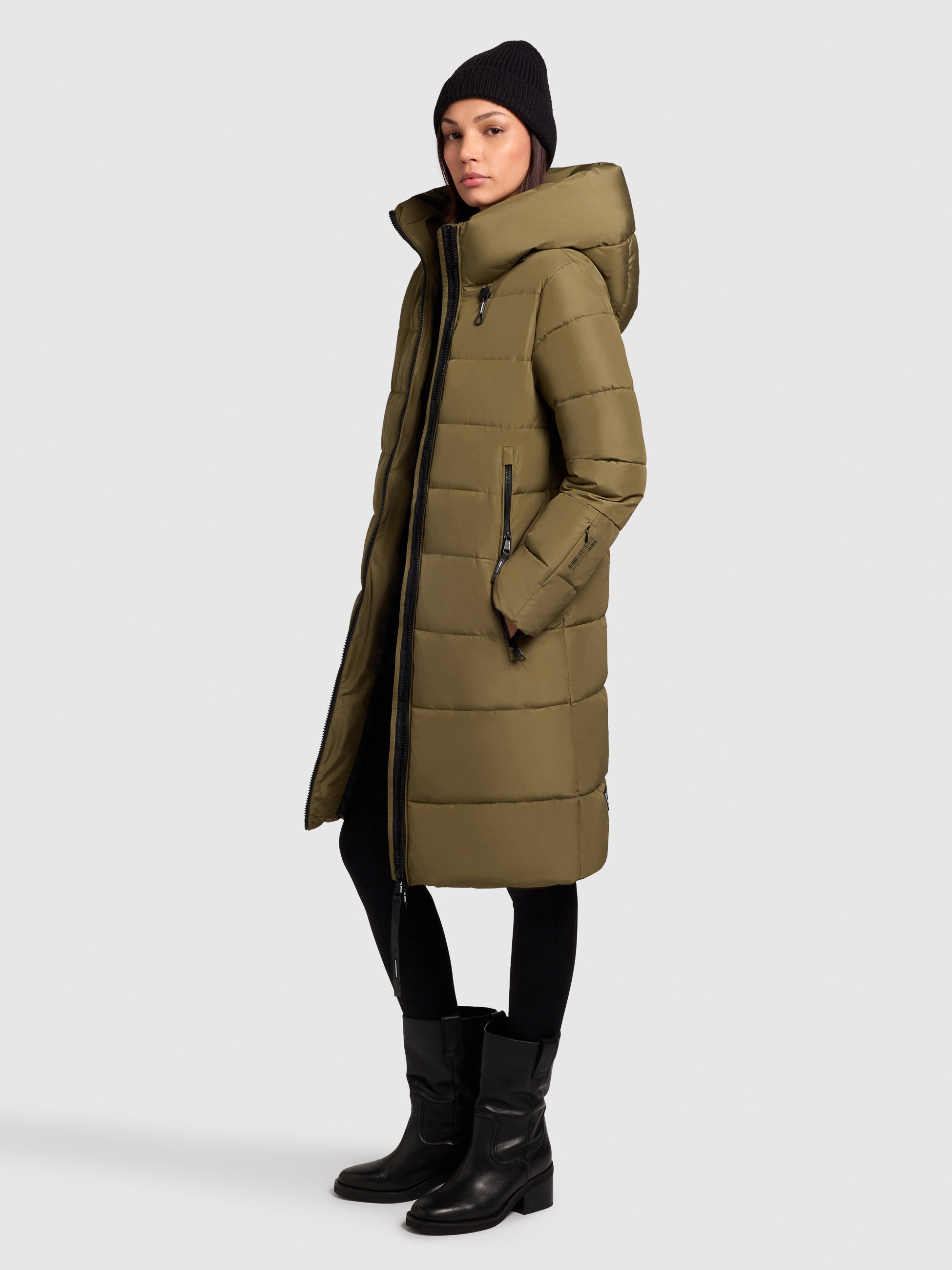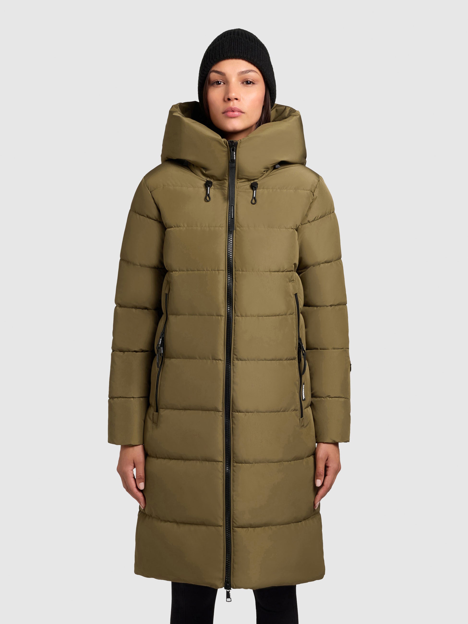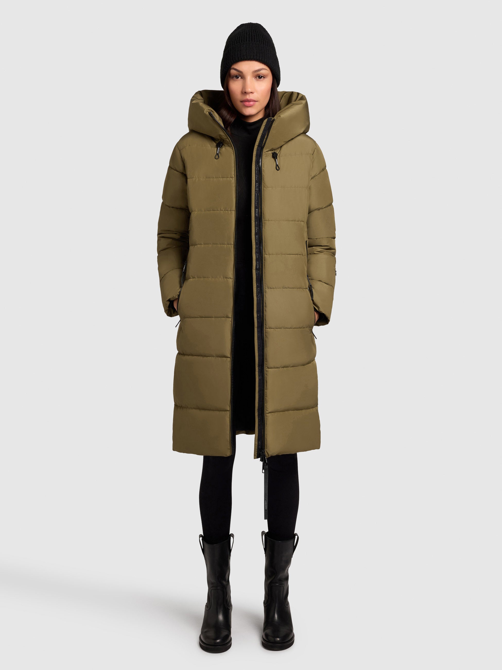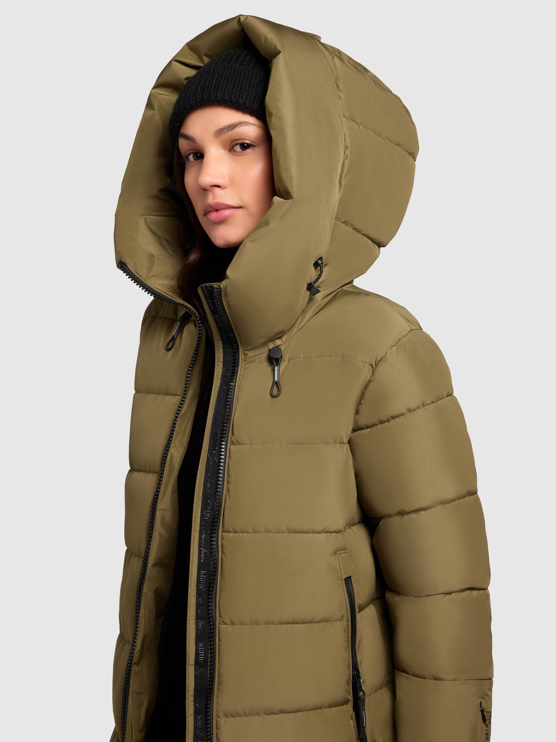 - hoch schließende Kapuze mit Kordelzug