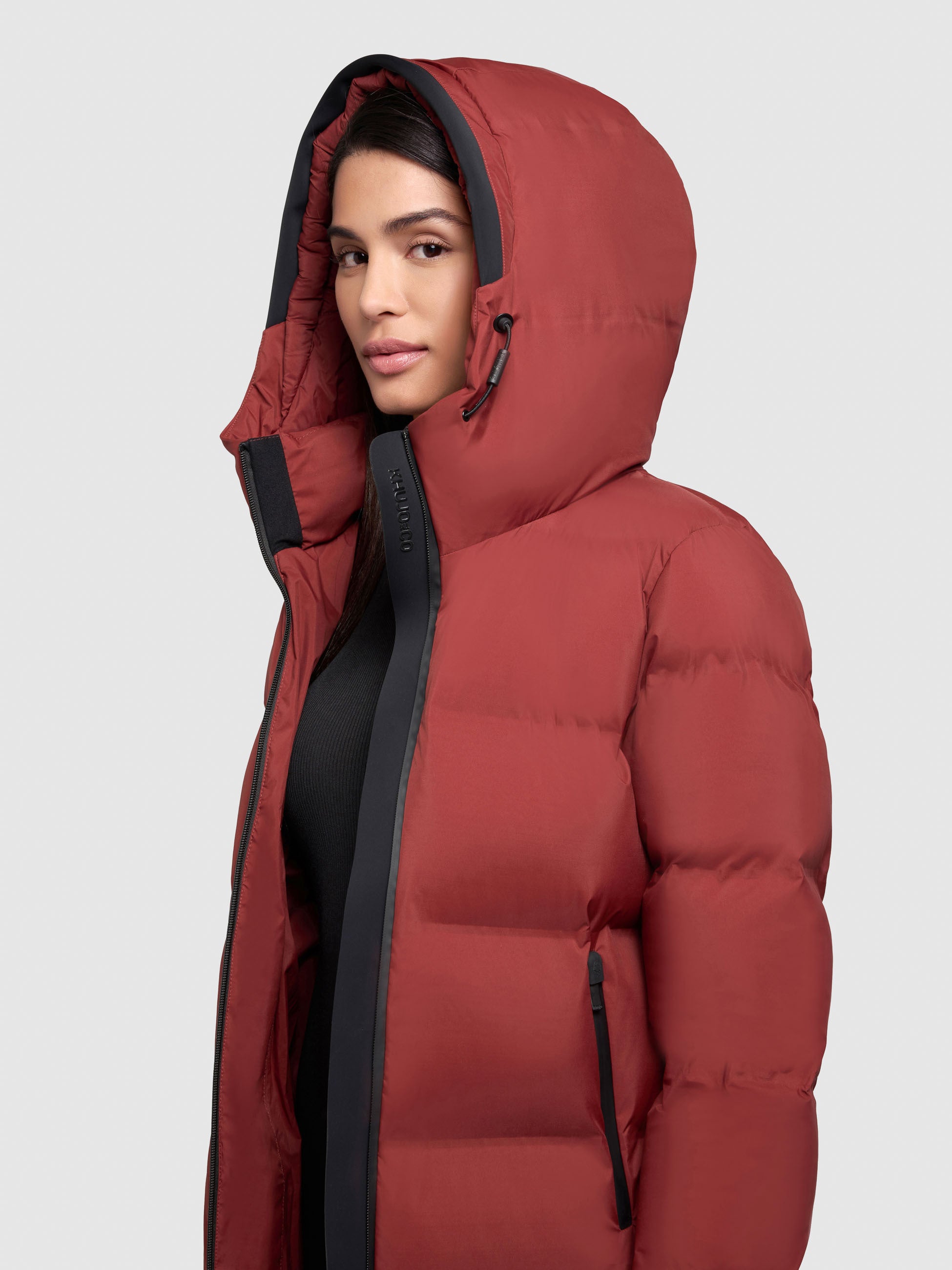 - hoch schließende Kapuze mit Kordelzug