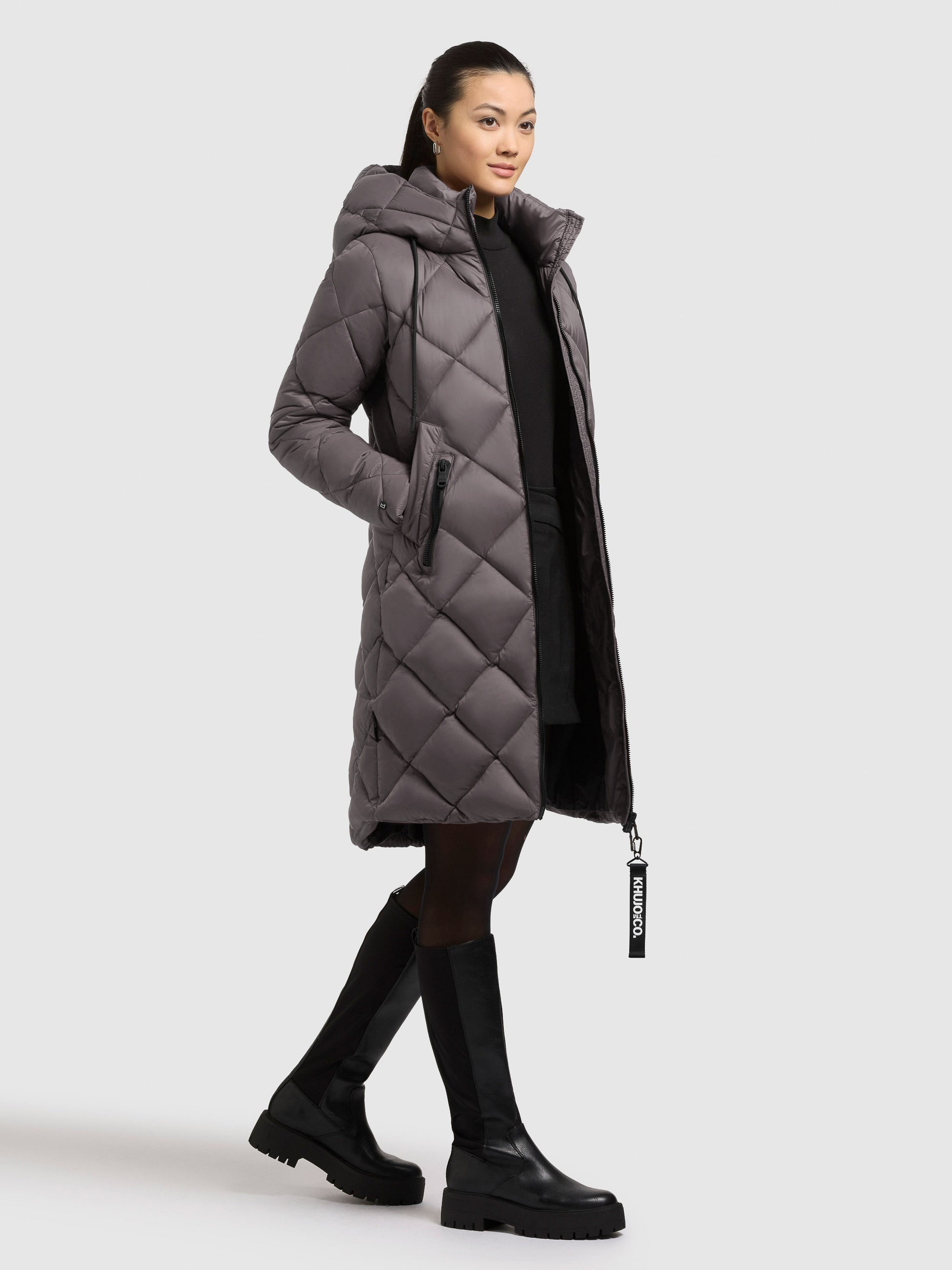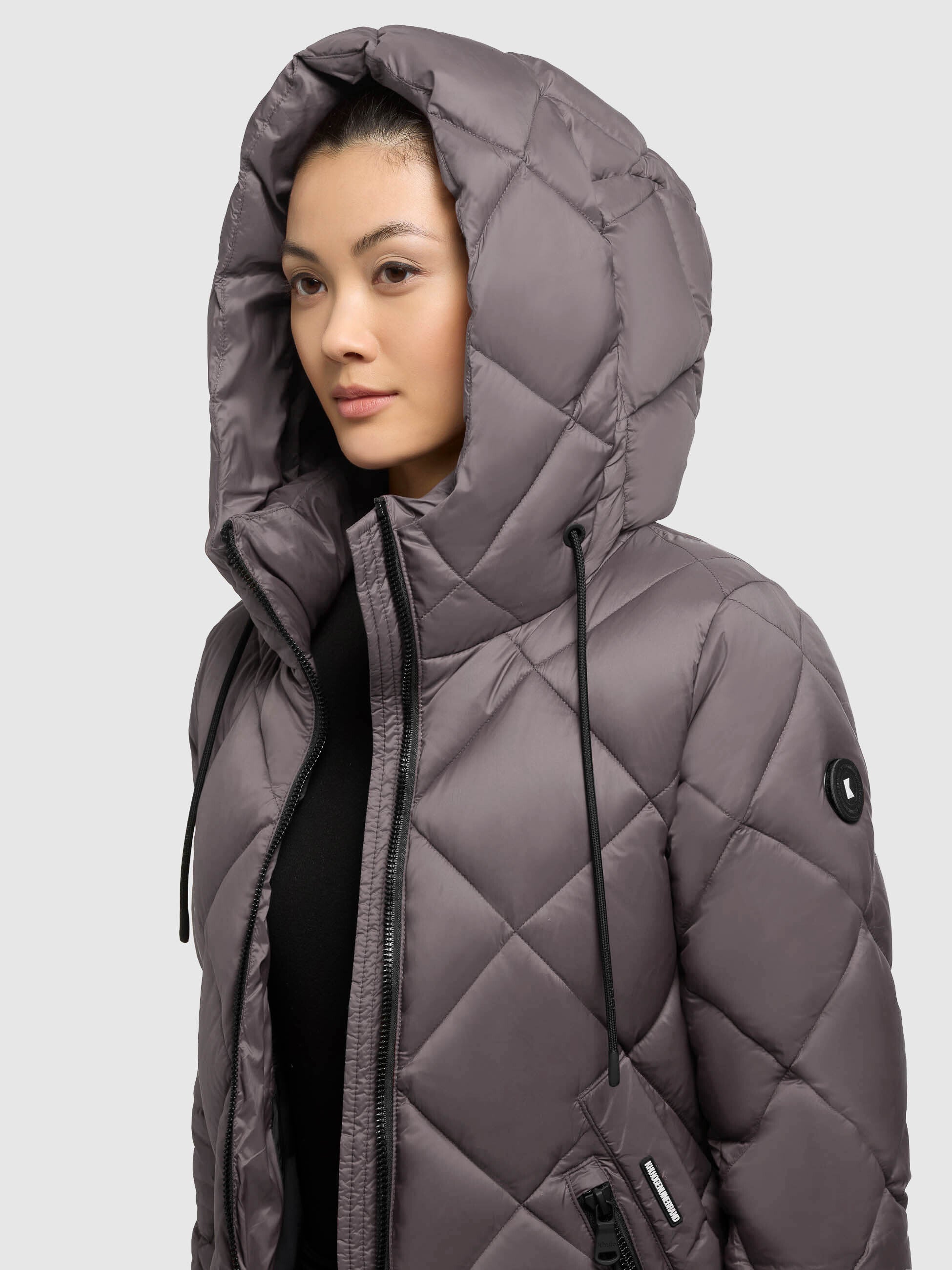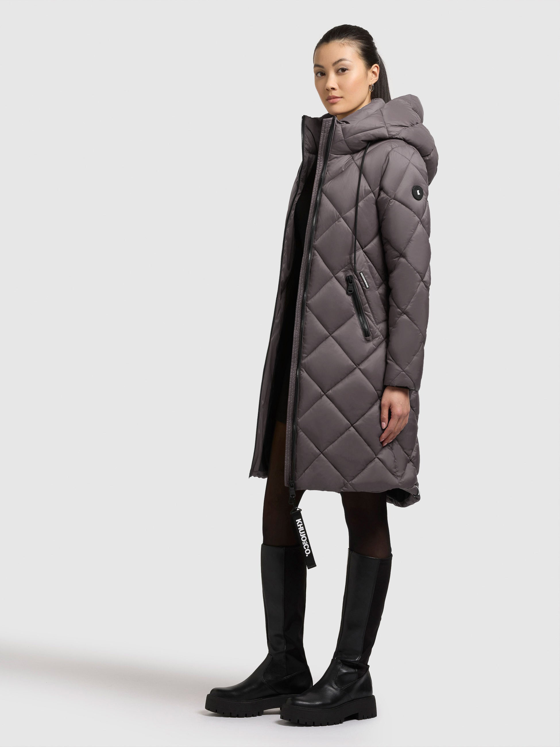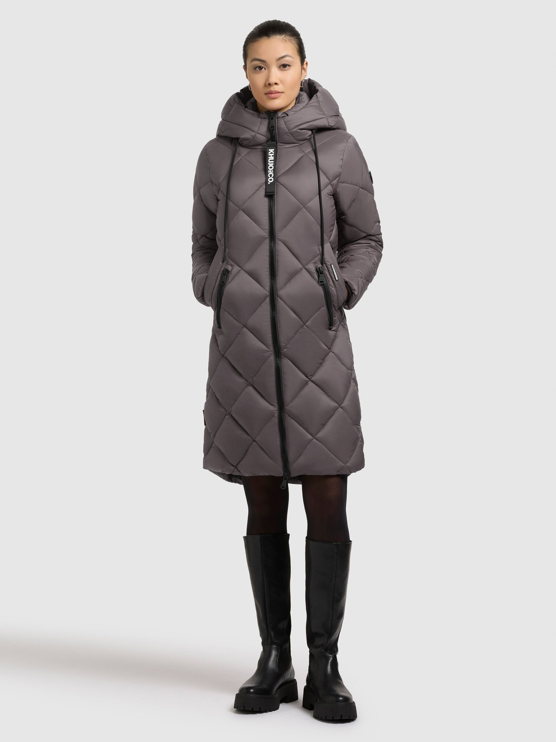 Dank dem gesteppten Rautenmuster und einer hoch schließenden Kapuze mit Kordelzug ist der warm wattierte khujo Mantel LINDA in dieser Saison ein echter Hingucker. Elastische Bündchen am Ärmelfutter, ein Zwei-Wege-Reißverschluss und ein verstellbarer Kordelzug am Saum bezeugen bei dem knielangen Steppmantel einmal mehr die Leidenschaft für Details von khujo. Deine Essentials lassen sich in Fleece gefütterten Eingriff- und Reißverschlusstaschen sowie verschließbaren Innentaschen sicher verstauen.