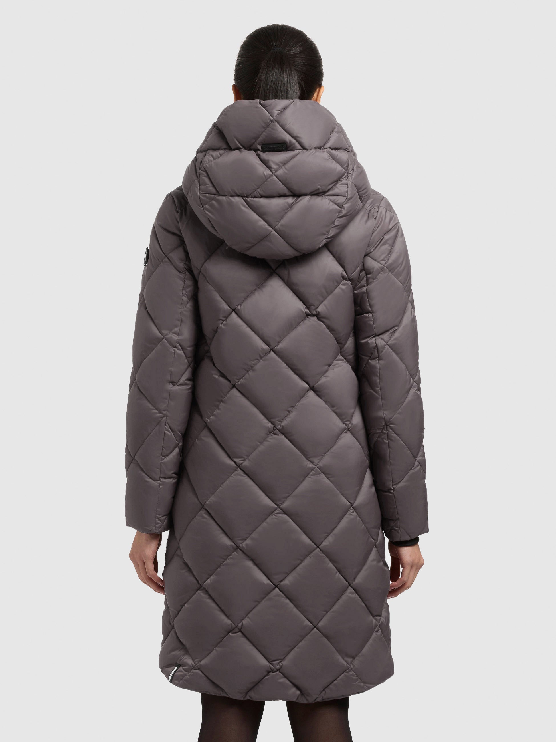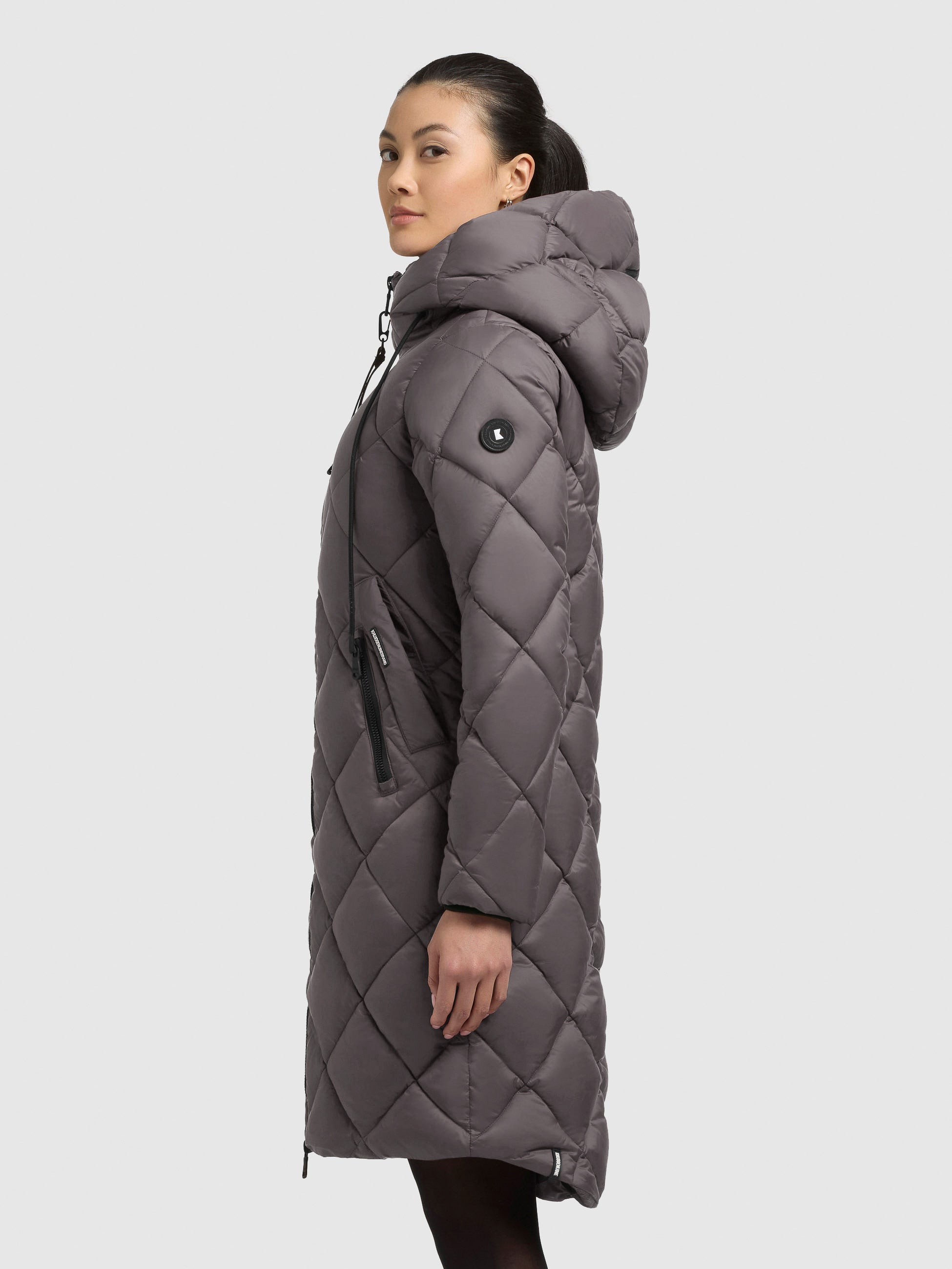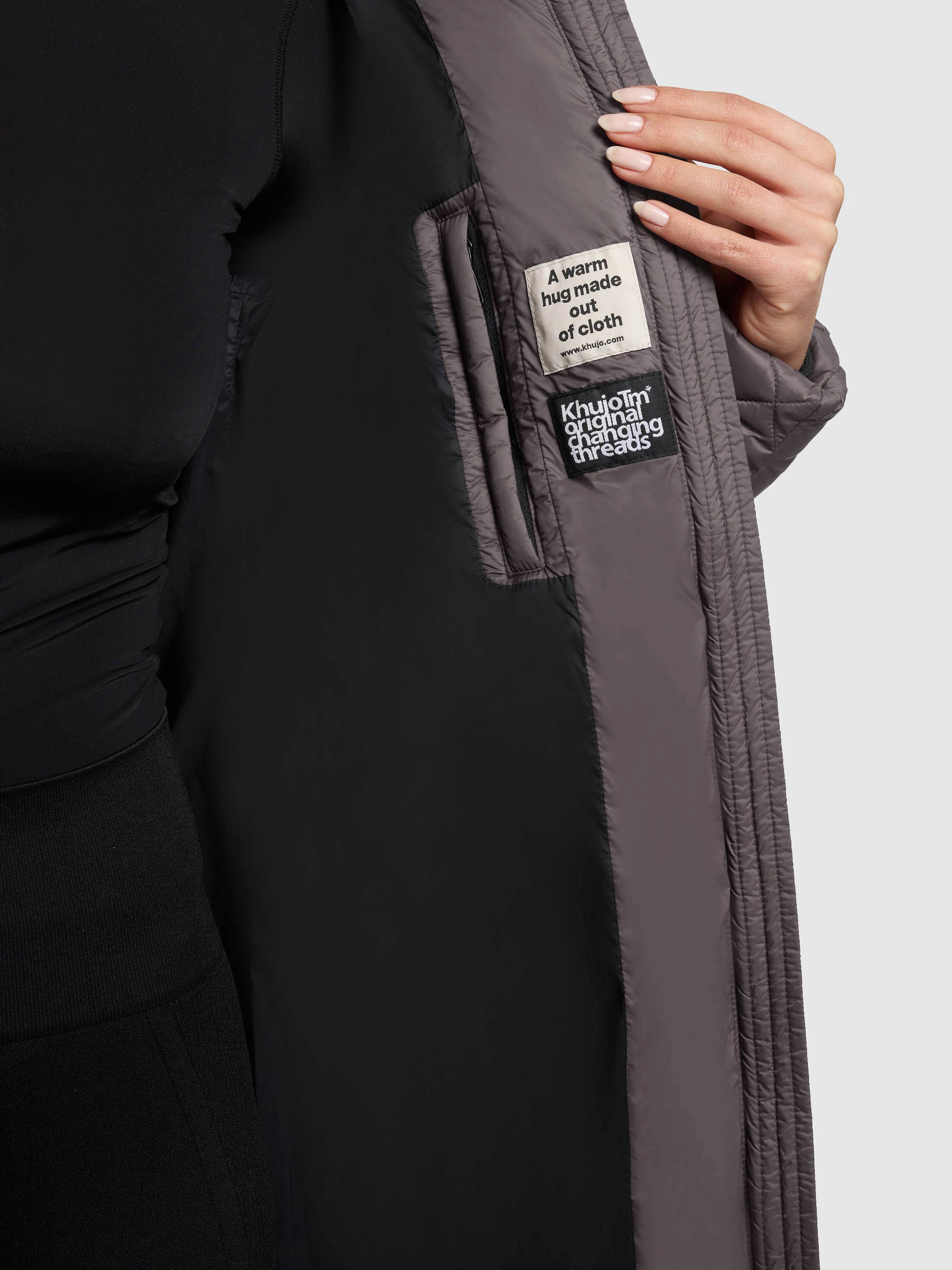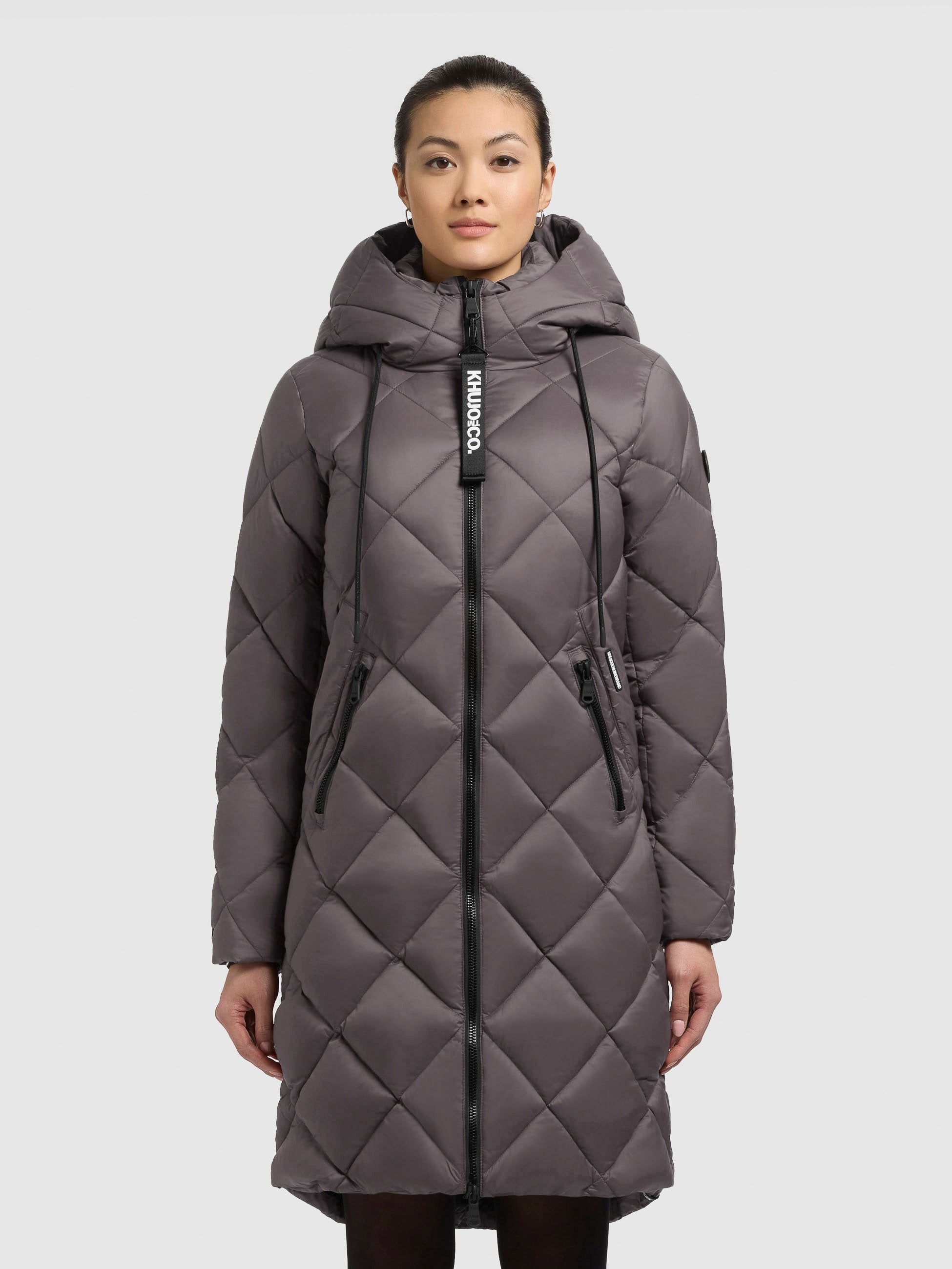 Dank dem gesteppten Rautenmuster und einer hoch schließenden Kapuze mit Kordelzug ist der warm wattierte khujo Mantel LINDA in dieser Saison ein echter Hingucker. Elastische Bündchen am Ärmelfutter, ein Zwei-Wege-Reißverschluss und ein verstellbarer Kordelzug am Saum bezeugen bei dem knielangen Steppmantel einmal mehr die Leidenschaft für Details von khujo. Deine Essentials lassen sich in Fleece gefütterten Eingriff- und Reißverschlusstaschen sowie verschließbaren Innentaschen sicher verstauen.