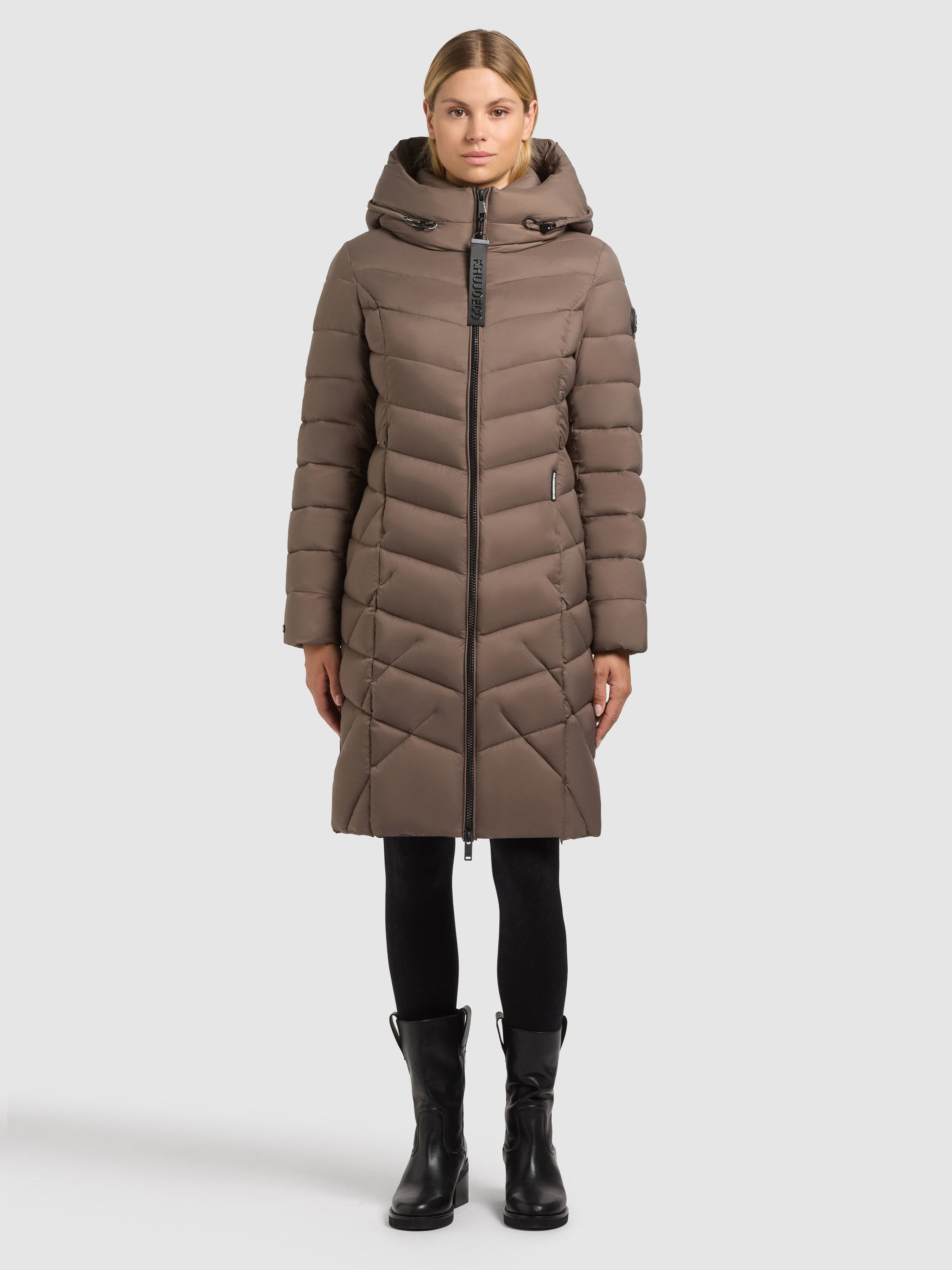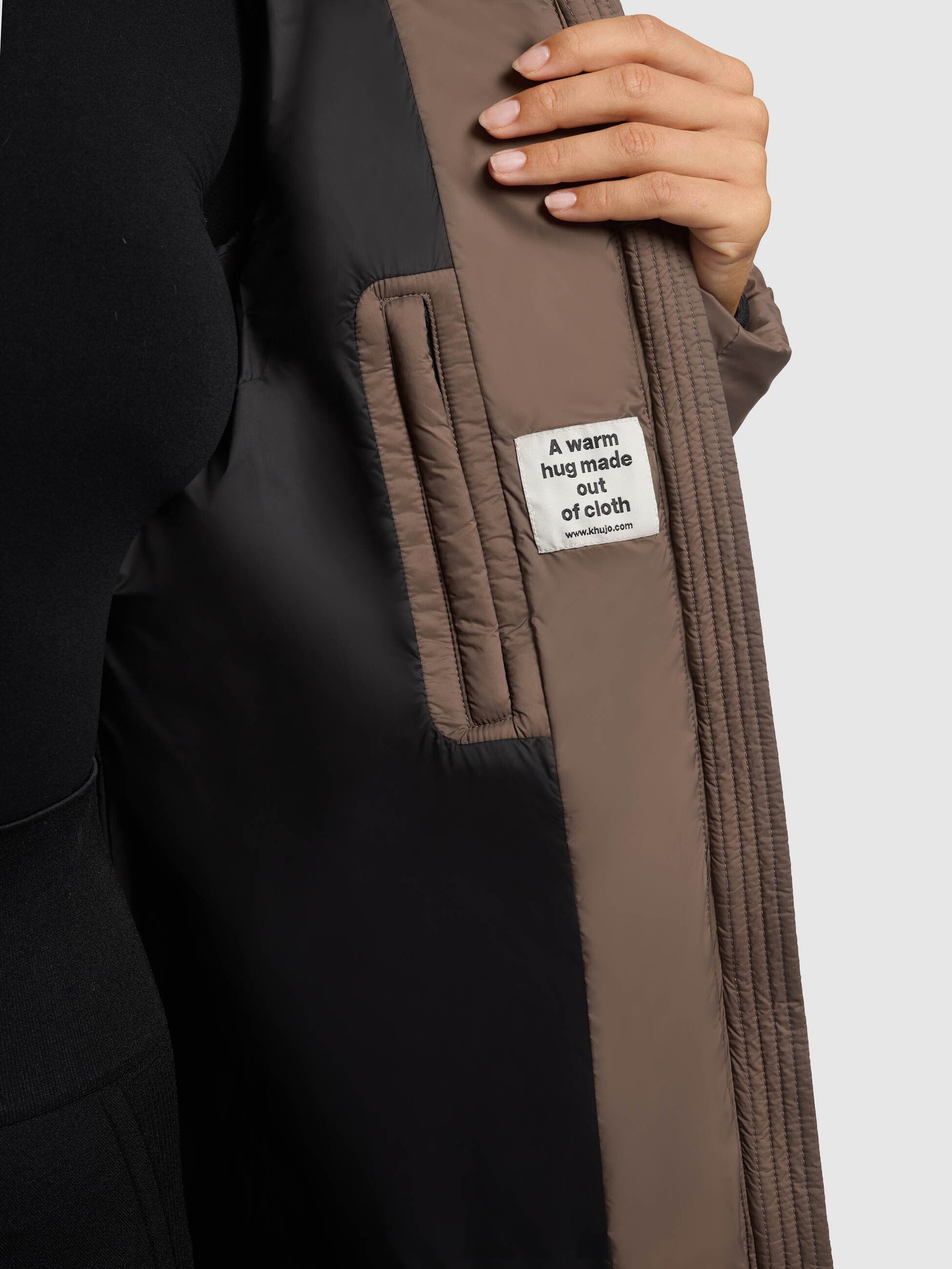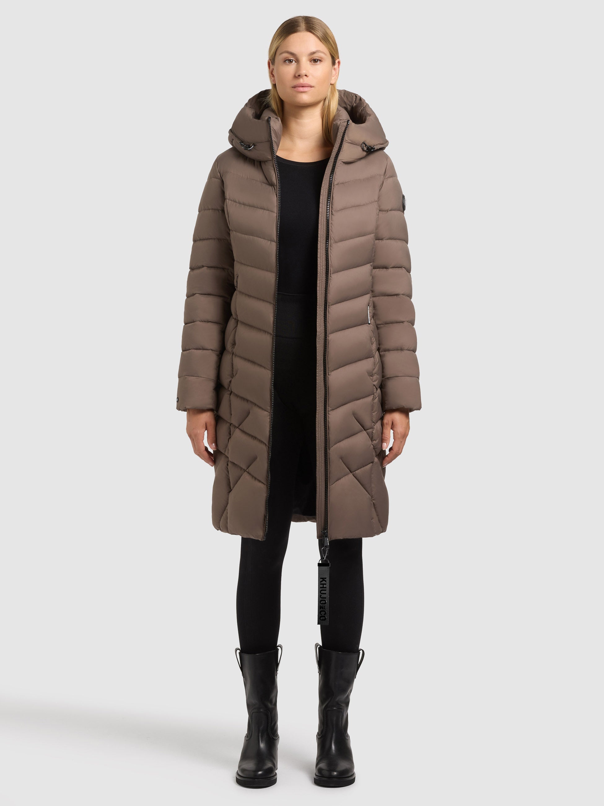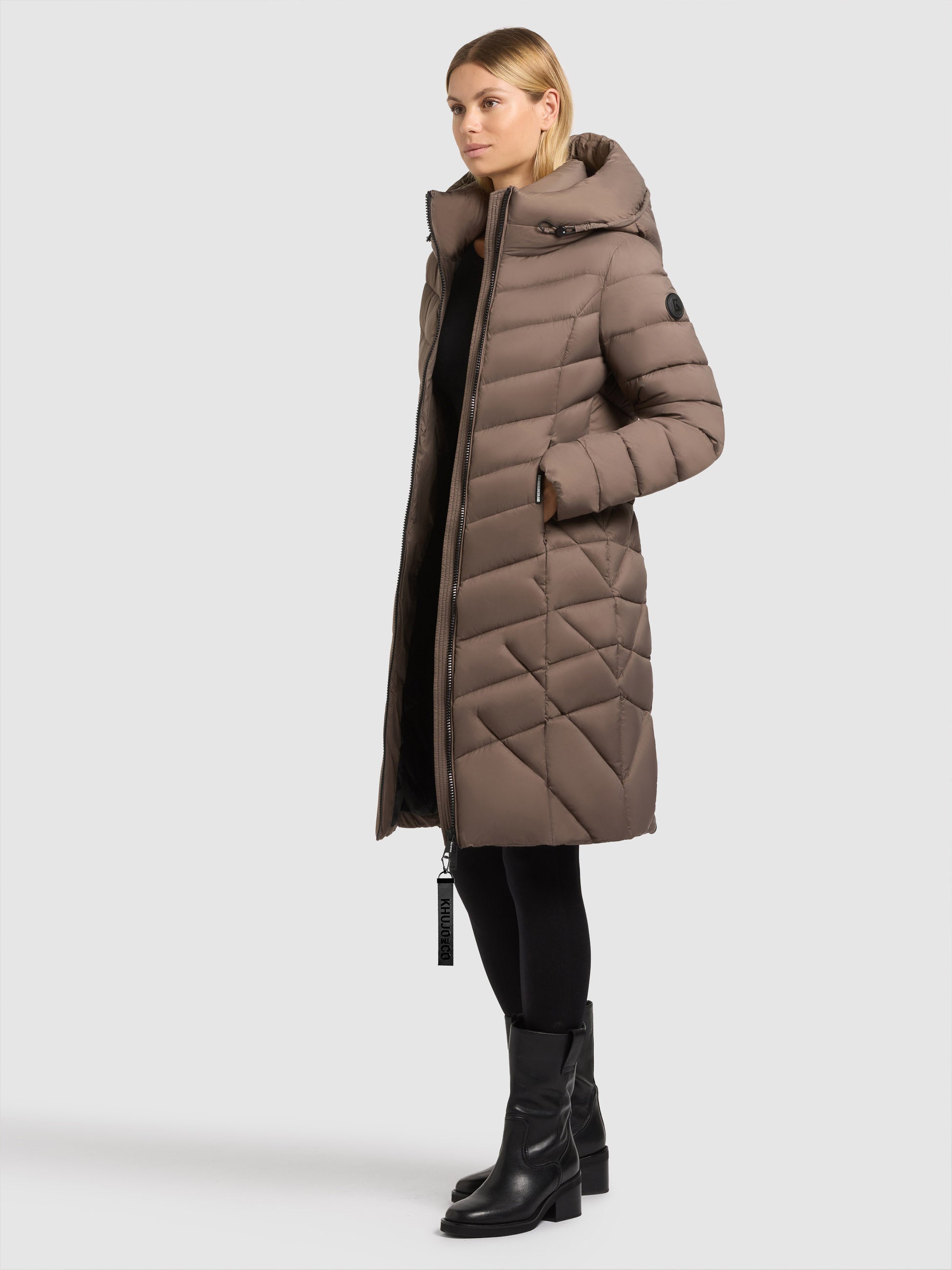 Der knielange Schnitt und das Steppmuster machen den warm wattierten khujo Mantel ODANA3 zum absoluten Eyecatcher. Eine gefütterte und hoch schließende Kapuze, ein wattierter Stehkragen, elastische Bündchen am Ärmelfutter und Taschenbeutel mit Fleece bezeugen bei diesem Steppmantel einmal mehr die Leidenschaft für Details von khujo. Kleinigkeiten lassen sich bei dieser Winterjacke in den Nahttaschen mit Reißverschluss und zwei verschließbaren Innentaschen sicher verstauen.