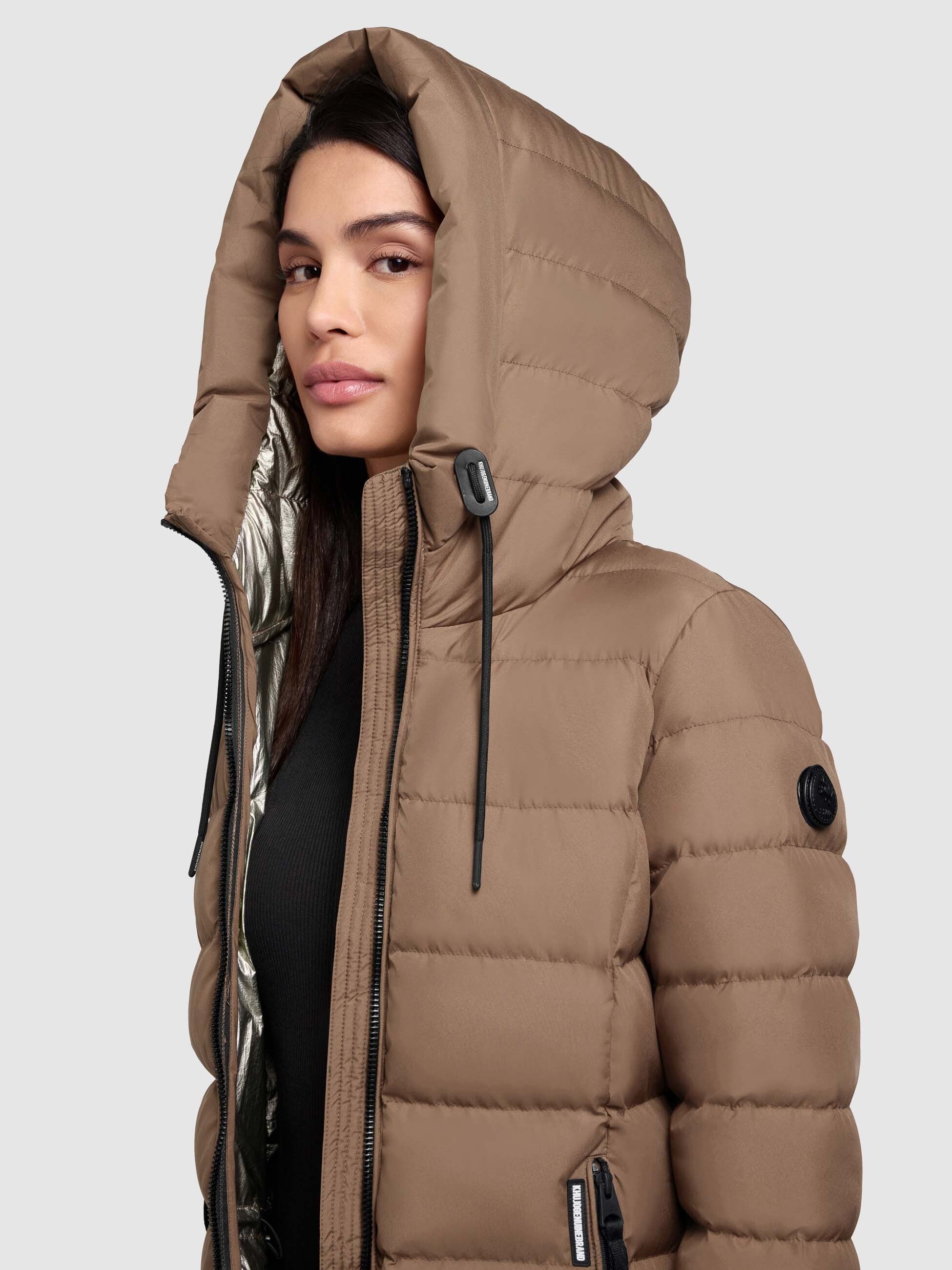 - hoch schließende Kapuze mit Kordelzug