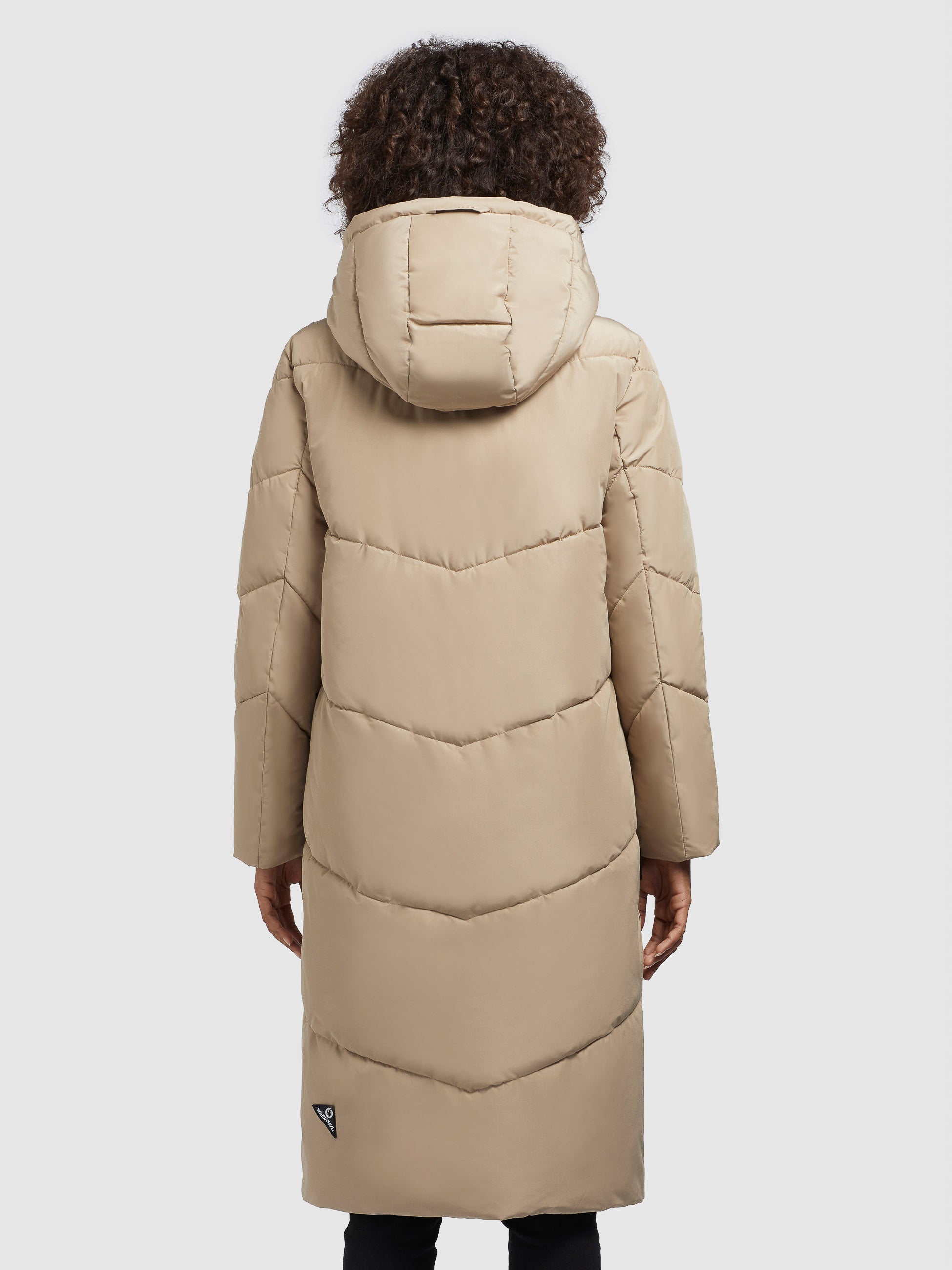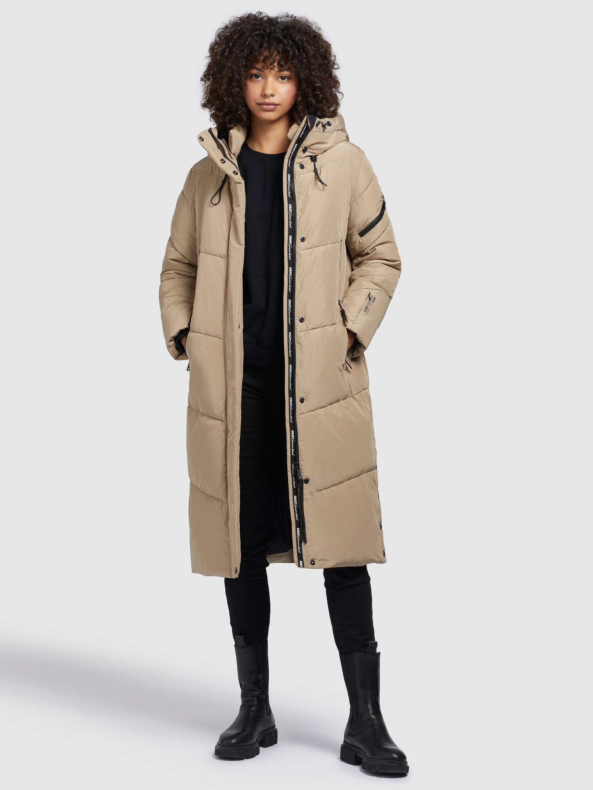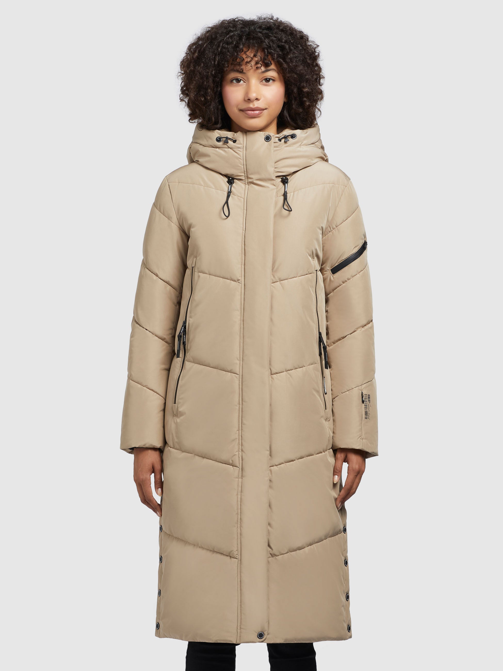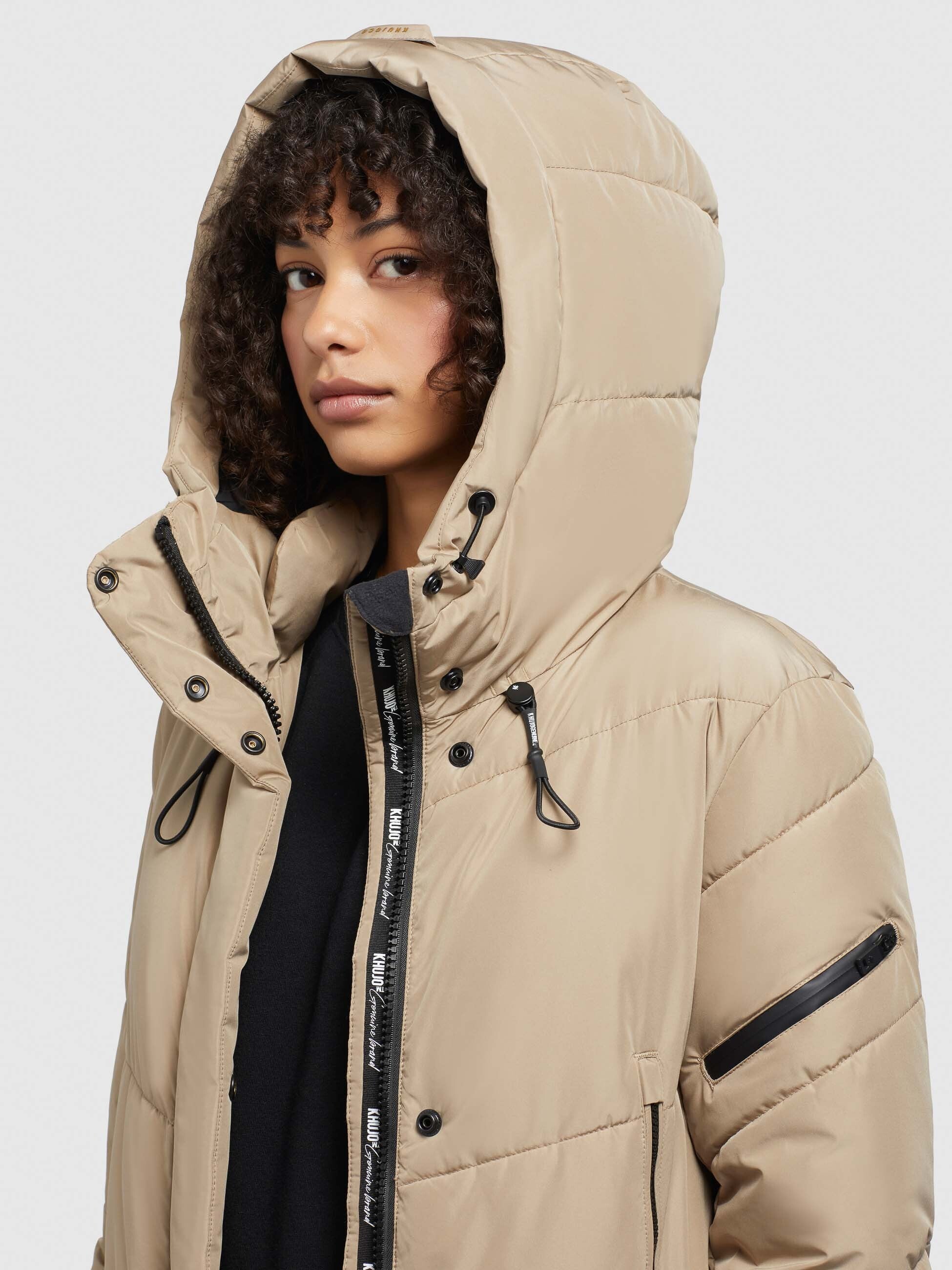 - hoch schließende Kapuze mit Kordelzug